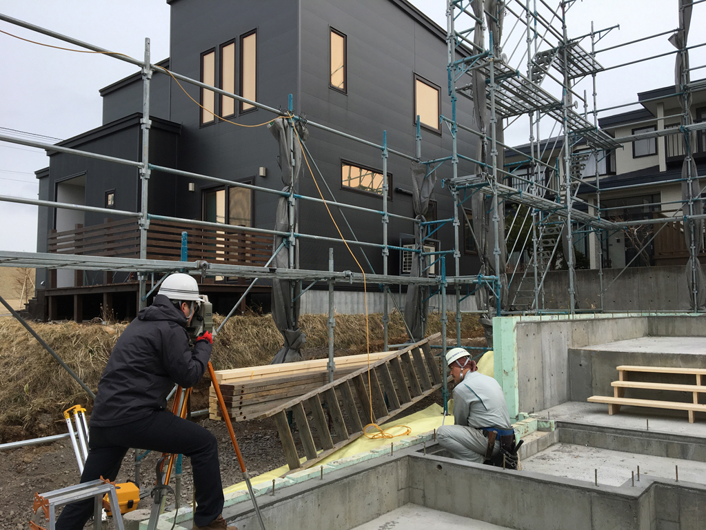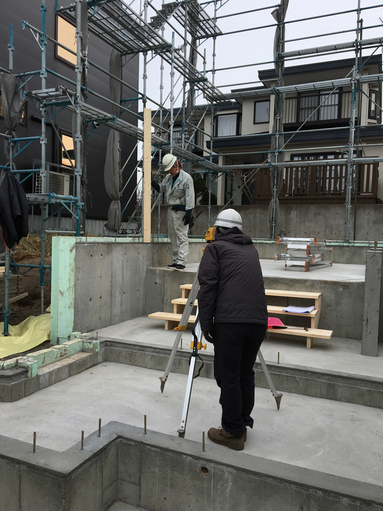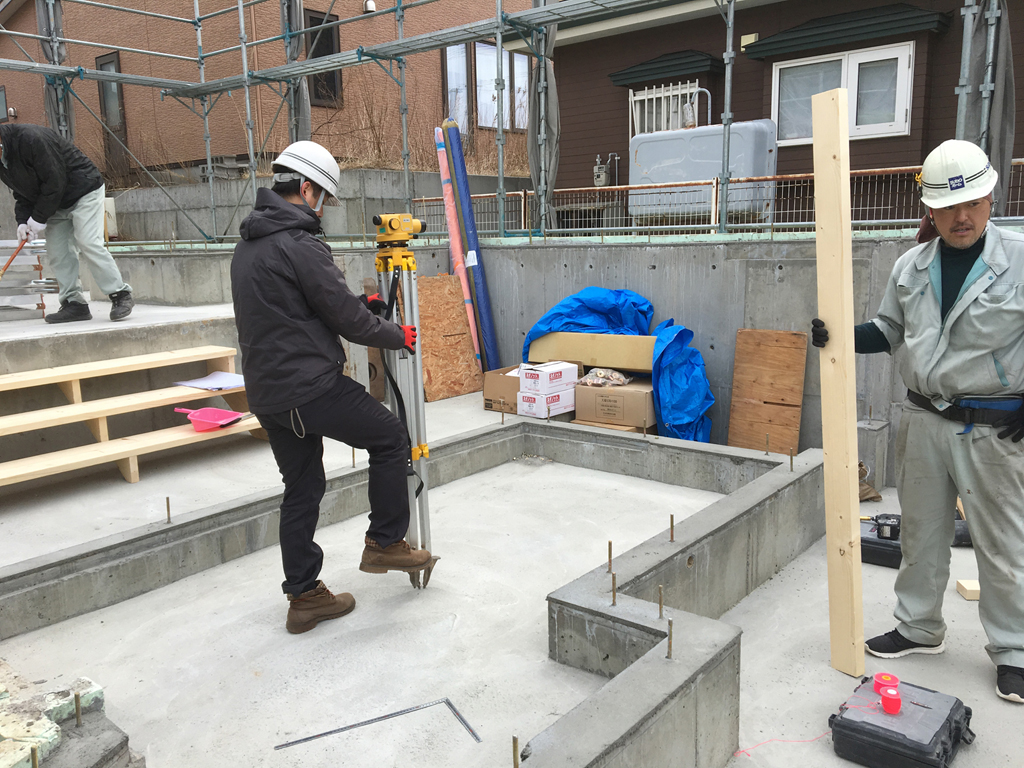 これから、基礎の立ち上がりの枠付けを行いますので基準となる墨を出し作業を進める為に行っていました。