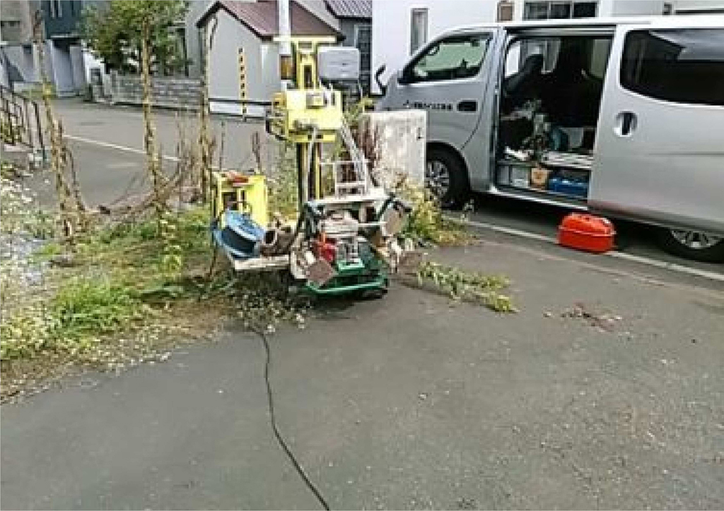 まずはスウェーデンサウンディング(SWS)試験です。機械で荷重をかけロッドを地中に差し込んでいき、その抵抗値で地盤の堅さを測定します。