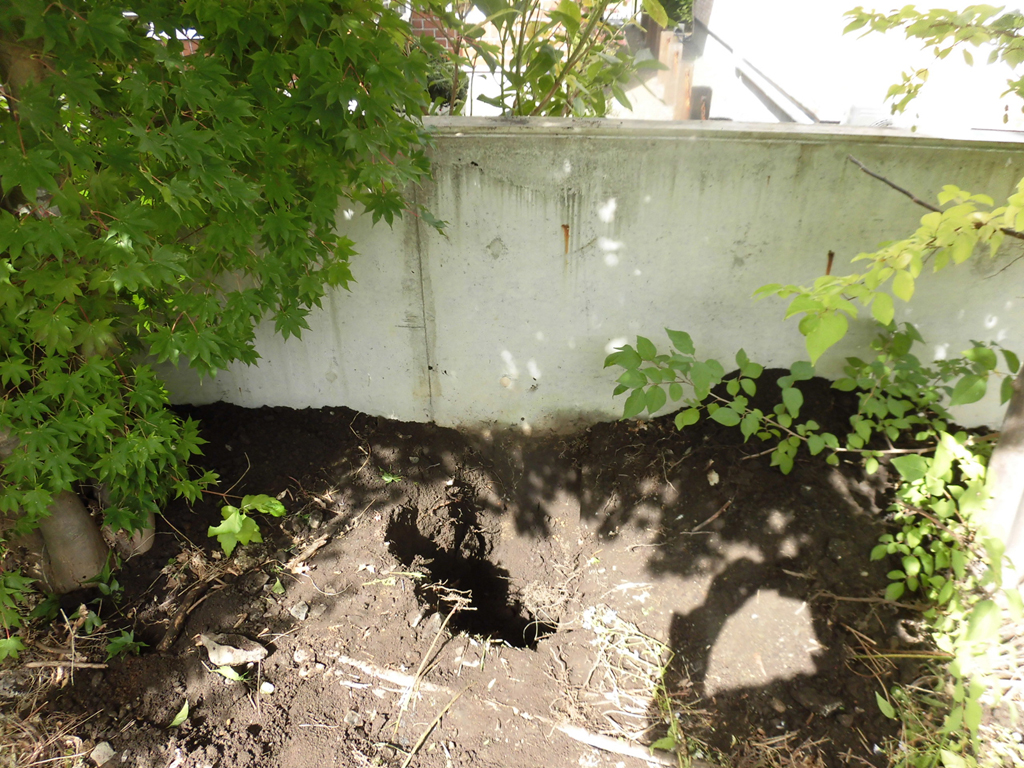 敷地いっぱいの計画になりましたので、念のためコンクリート塀の基礎をチェック!! 住宅の基礎と干渉しない事を確認!
