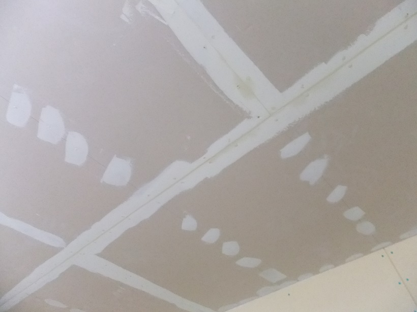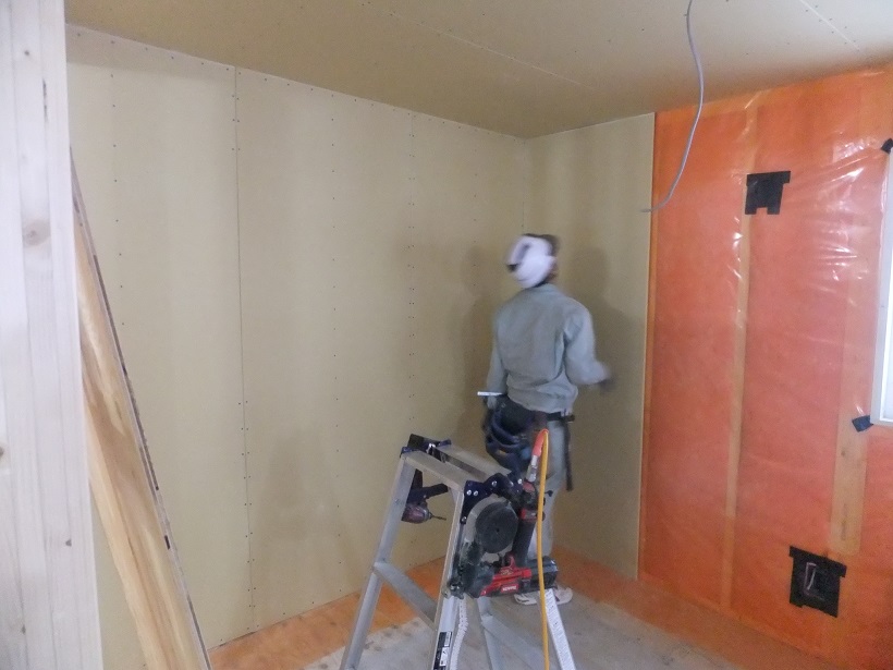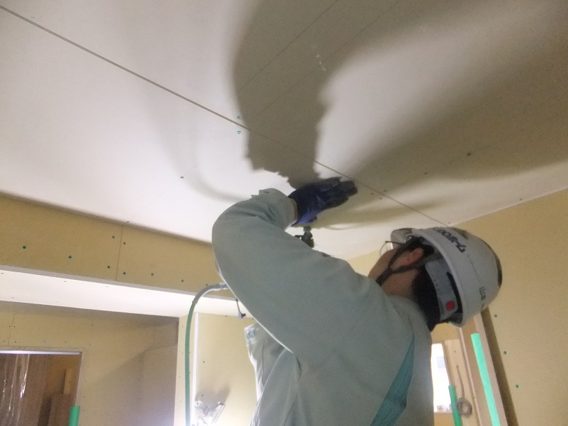 Y本くんは1階天井の石膏ボードを張っていきます。
