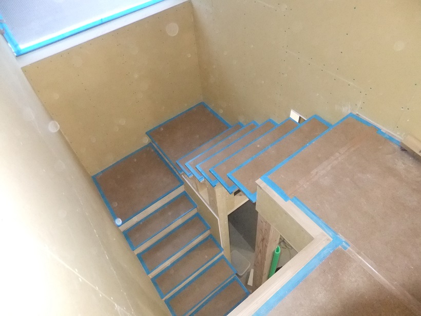 土台、大引き、床合板を敷き、すかさず養生です!