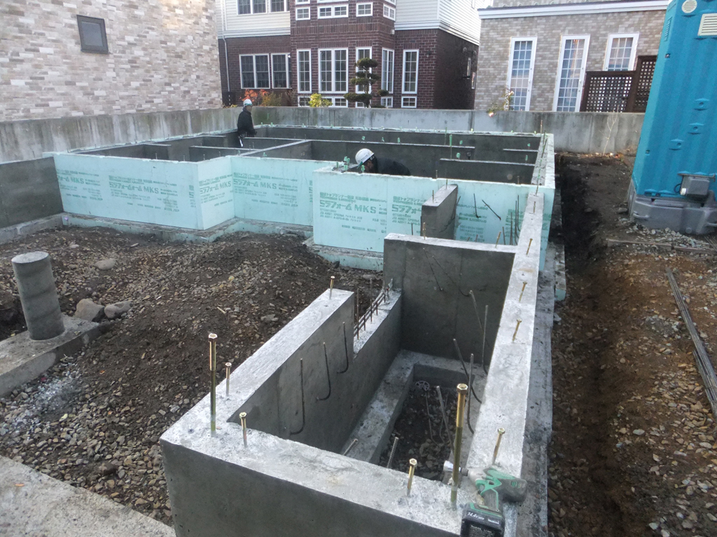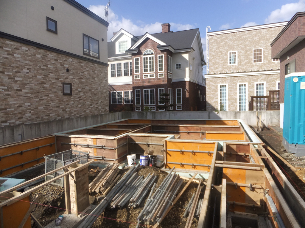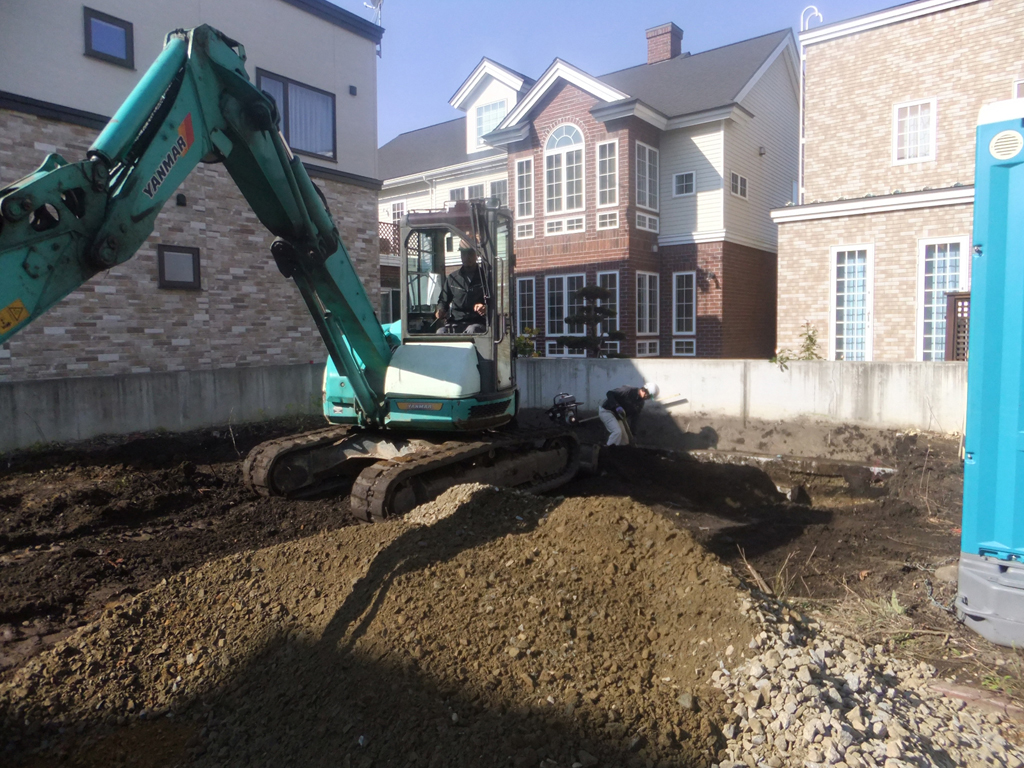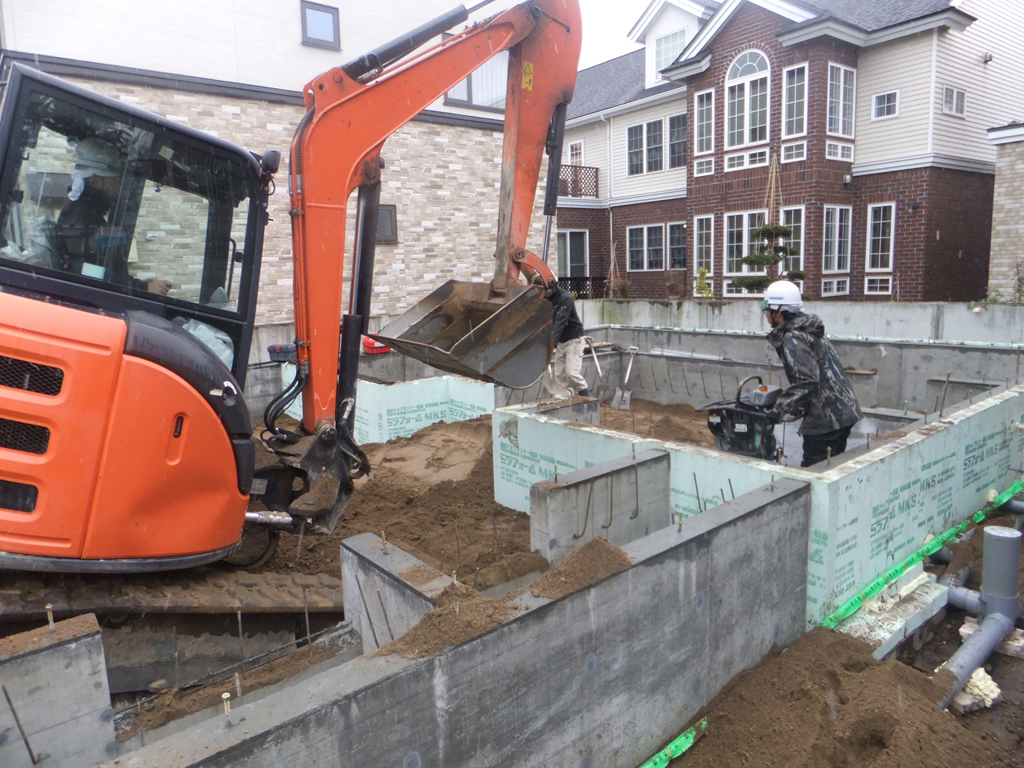 通常札幌の場合は基礎の深さは地中から60cmと決められており、基礎の下に砂利を10cm程度敷き均します。