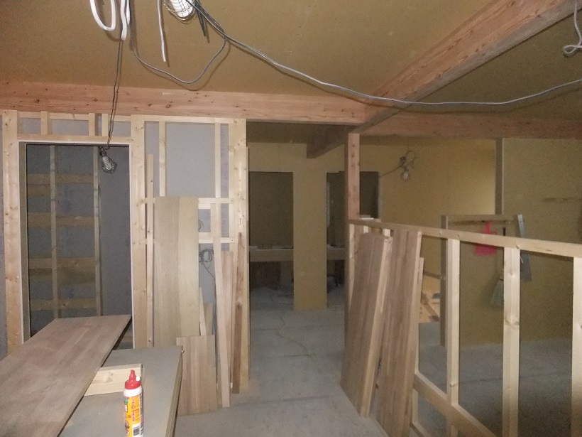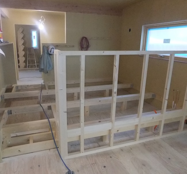 2階リビングにあるフリースペースは一段上がるので床合板の上に下地を組んでいきます。