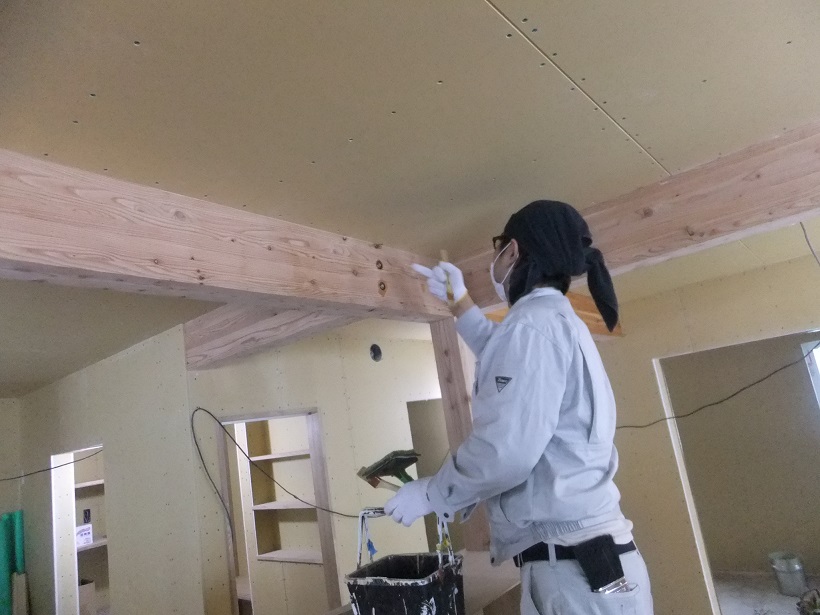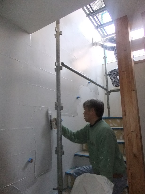 引き続き左官やさんが珪藻土入塗壁の仕上げに取りかかります。