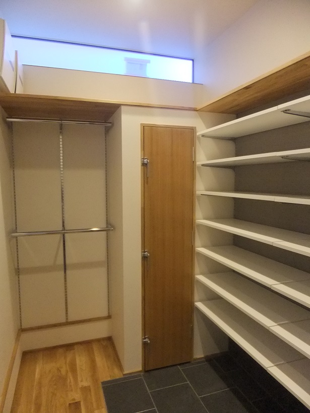 玄関横のシューズクローゼットは可動棚と可動式のコート掛けで、こちらも収納たっぷりです。