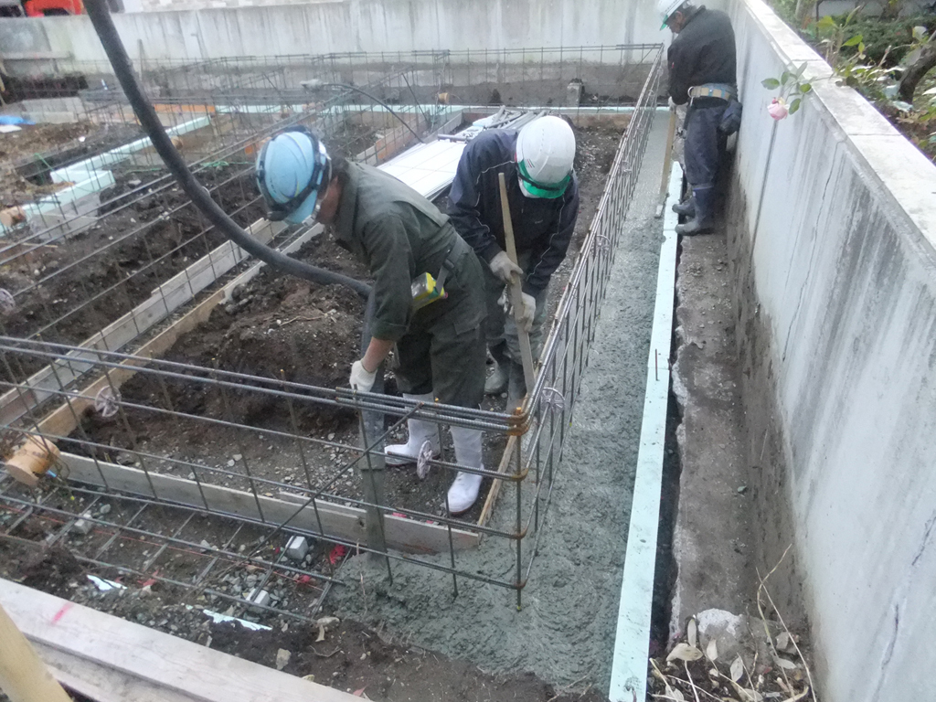 ホースで流す人、振動機でコンクリートをスムーズにする人、木ヅチで枠をたたき、隙間なく充てんさせる人。
