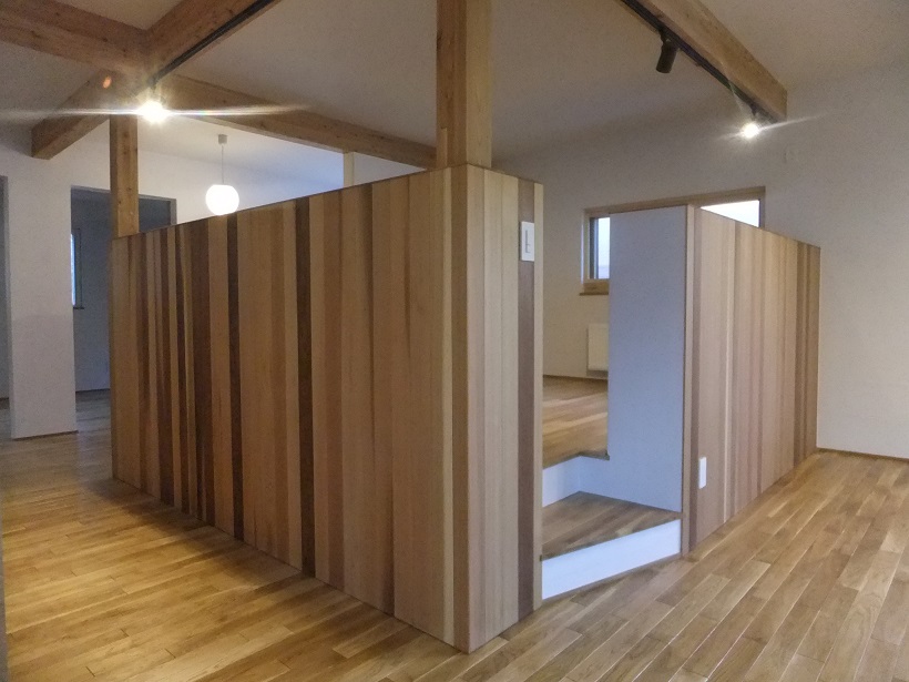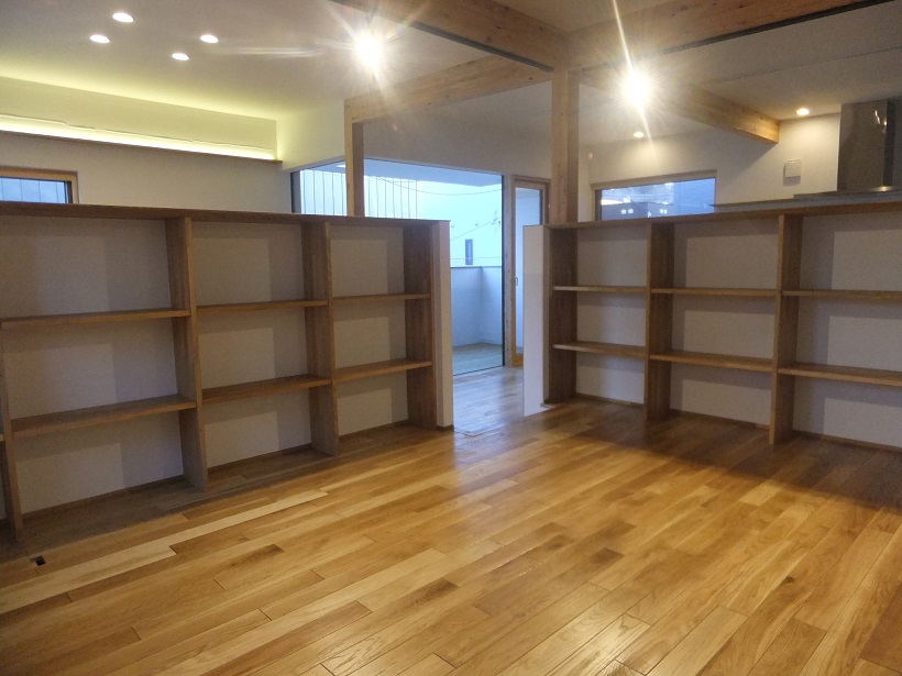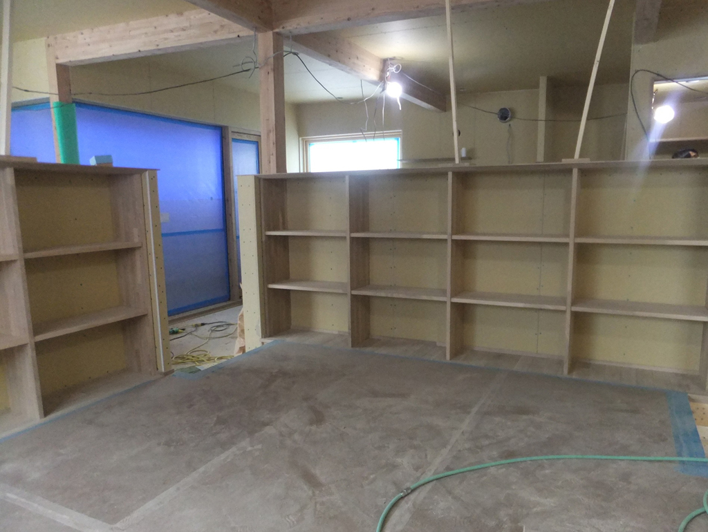 先ほど紹介したフリースペースですが内側はニレ集成材で制作した可動棚になります。