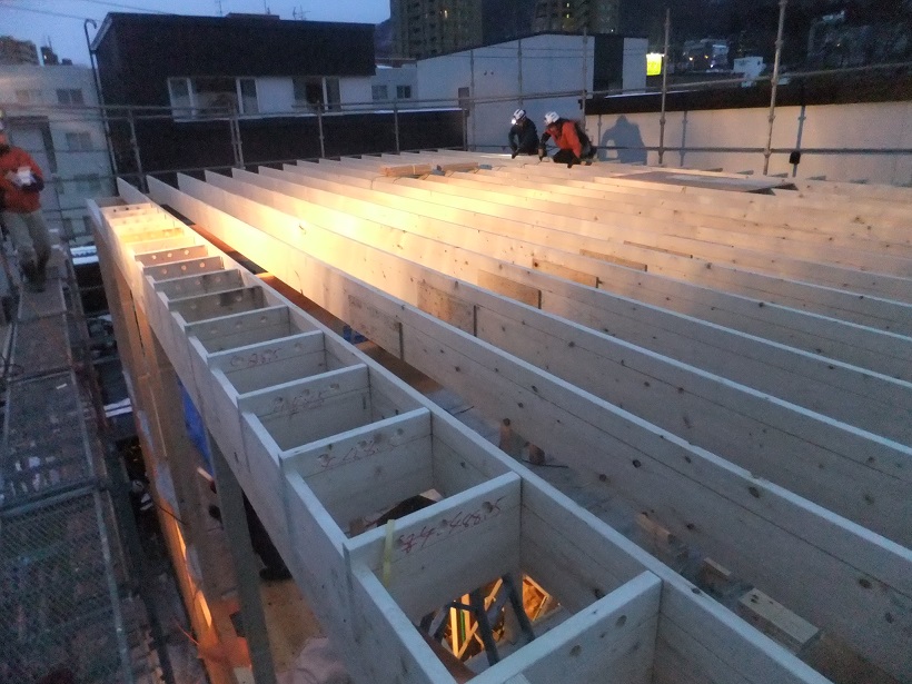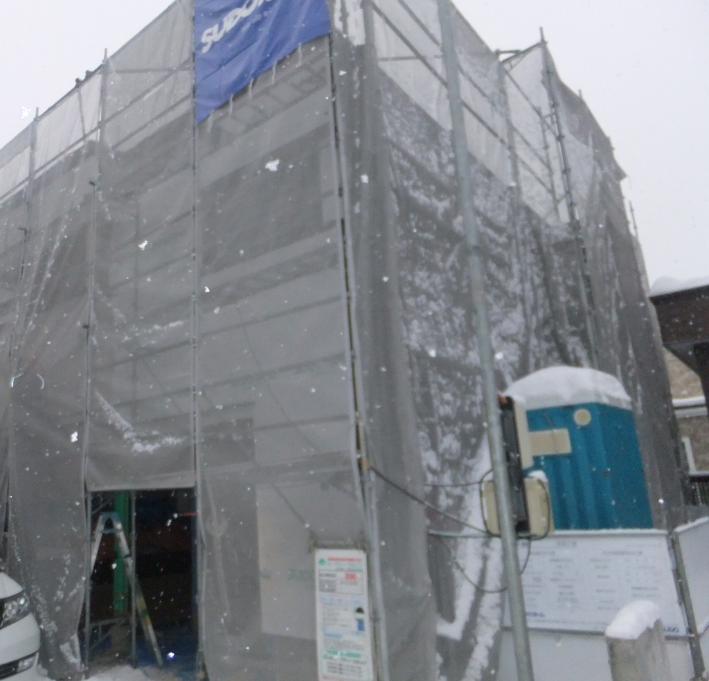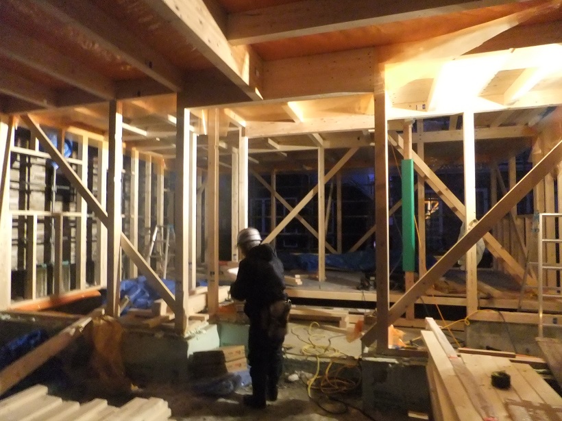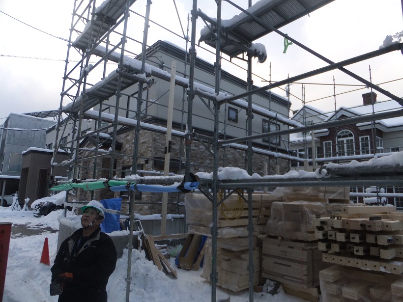雪に負けることなくすでに構造材が組み上がっています。