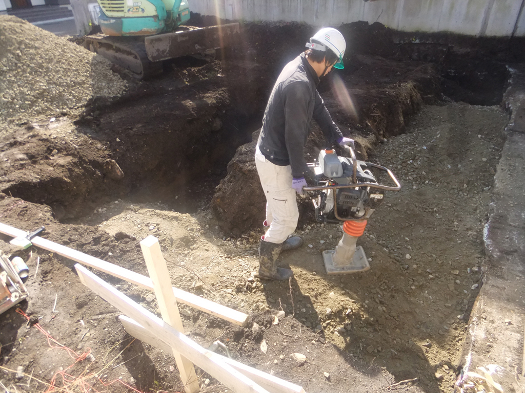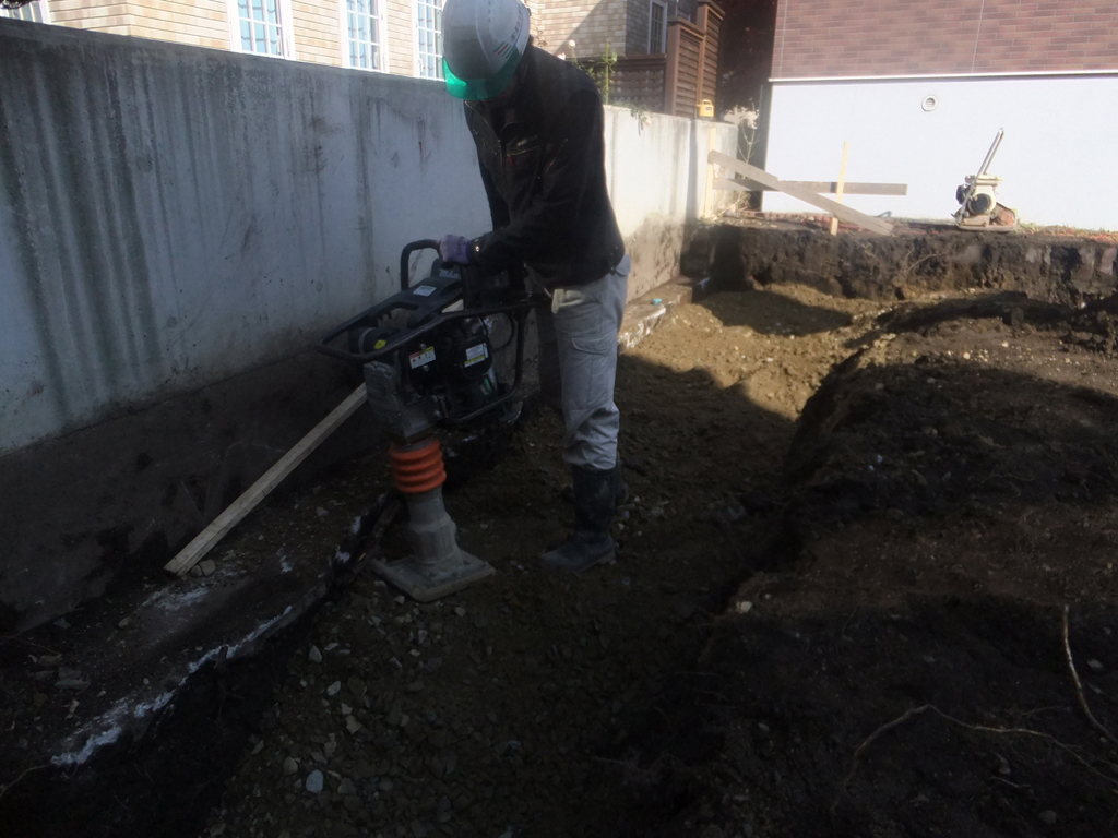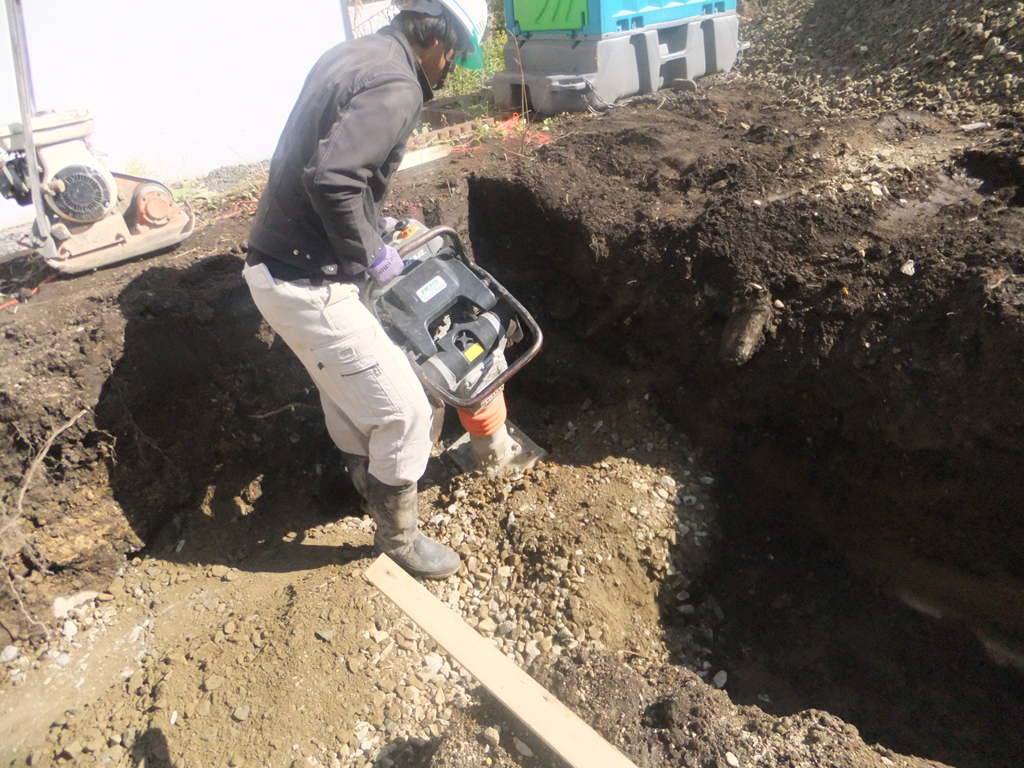 掘ったら砂利を入れて転圧です!!ランマ―でしっかりと砂利を締め固めます。