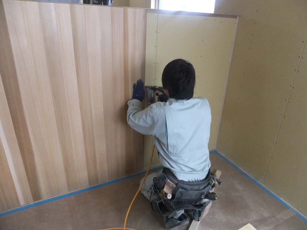 リビング側にはウエスタンレッドシーダーの羽目板を張っていきます。