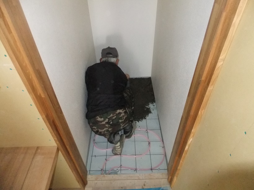 前回床暖パイピングを施工したので、左官やさんがモルタルをならしていきます。