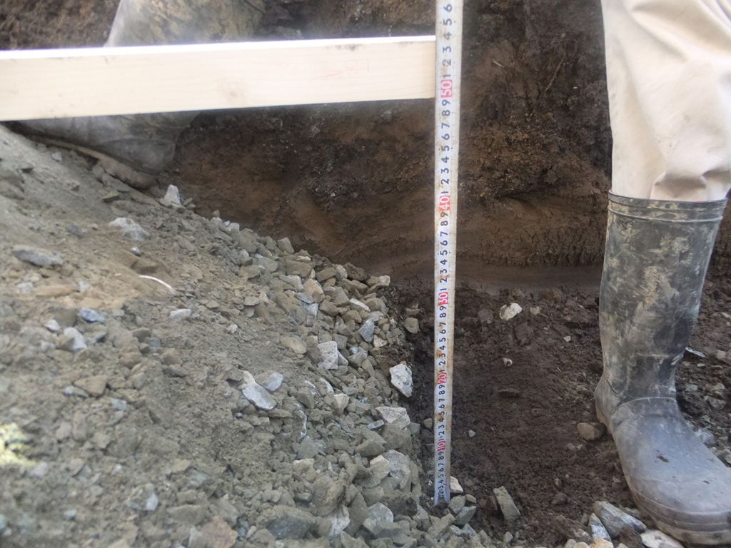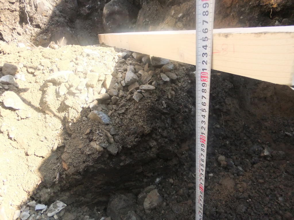 でも今回の場合は1.1mの深さに堅い層がある為、砂利をいつもより40cm深く、合計50cm入れて締め固める事が条件となりました。