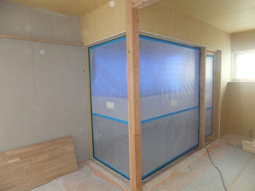 前回取り付けを行ったリビングのカーテンウォールまわりのボード貼り完了です。