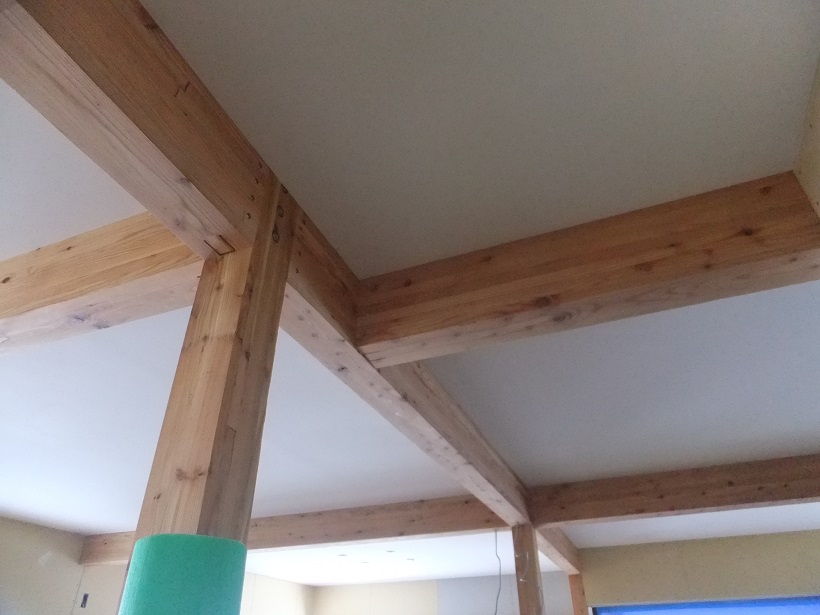 大工さんが造作したカウンターや建具枠、構造の化粧梁をリボスのクリアで仕上げていきます。