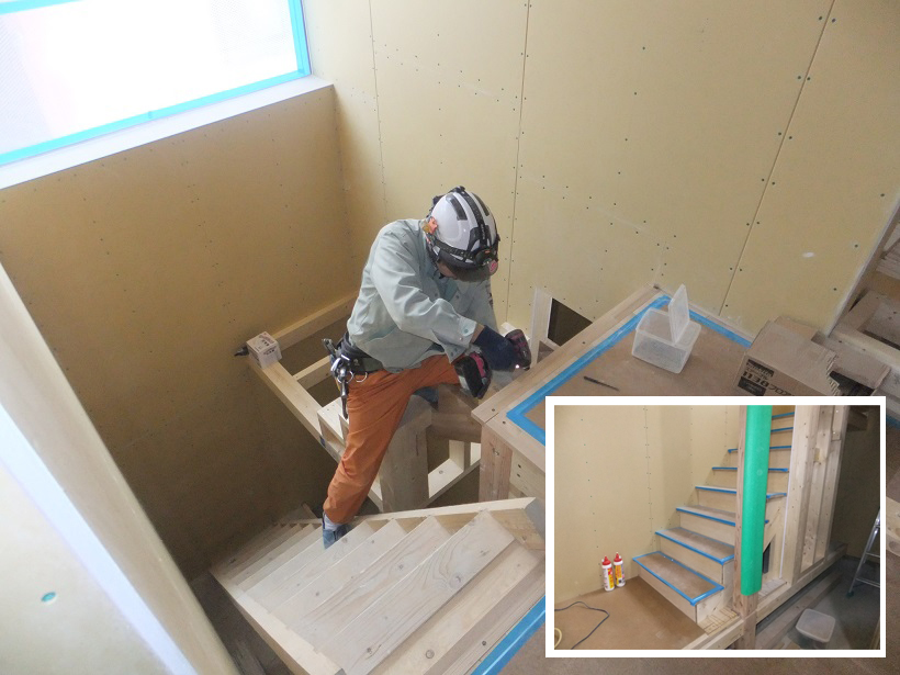 続いて階段の造作に取りかかるM口棟梁。