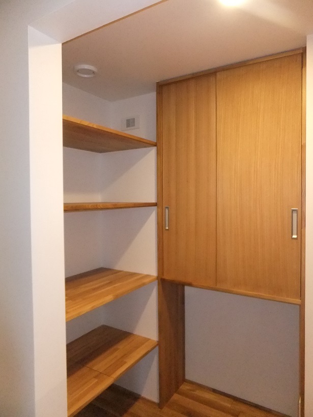 キッチン横のパントリーには家電用の固定棚、食器は建具付きの収納でたっぷり収納です!