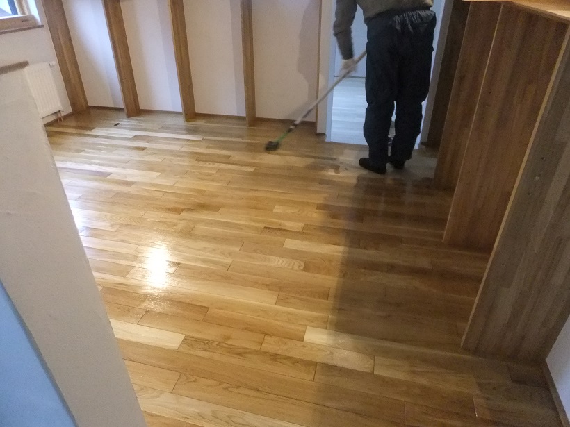 またまた塗装やさんが登場し、他の木部と同じリボスのクリアでフローリングを仕上げていきます。