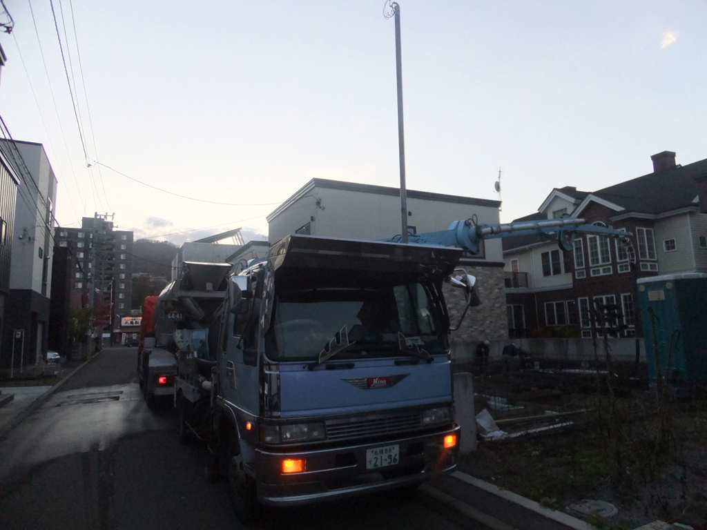 ポンプ車登場! ミキサー車からコンクリートを入れて・・・