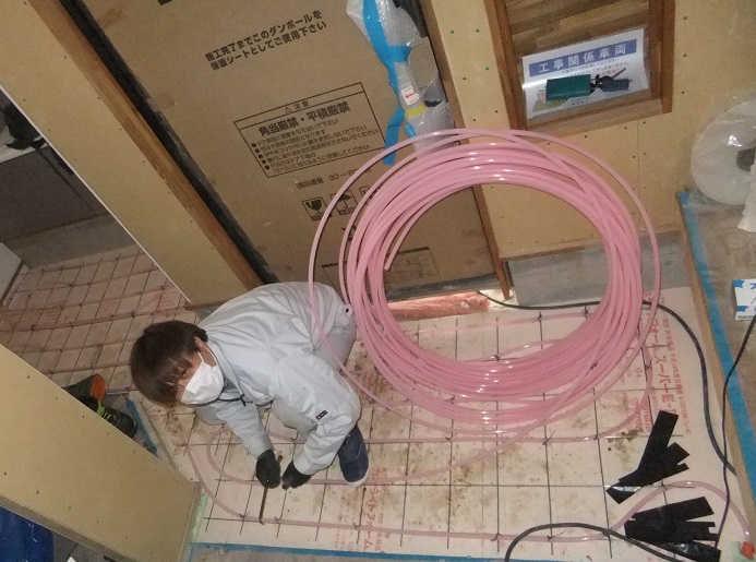 次は左官屋さんの登場ですが、その前に玄関などタイルを張るところは床暖になりますので設備屋さんの登場です。