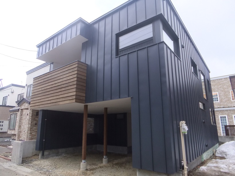 外壁はガルバリウム鋼板と道南杉ヨロイ張り、写真には写っていませんが、玄関廻りとバルコニーはカルクウォールの組み合わせになります。