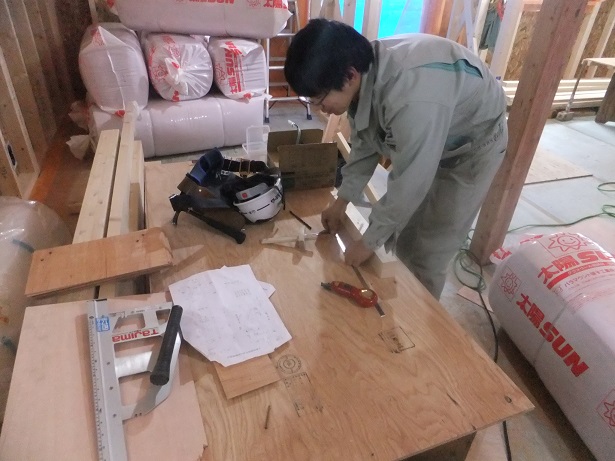 第6回で現場に入ってきたニレ集成材を使い建具枠の取り付けをするM口棟梁。