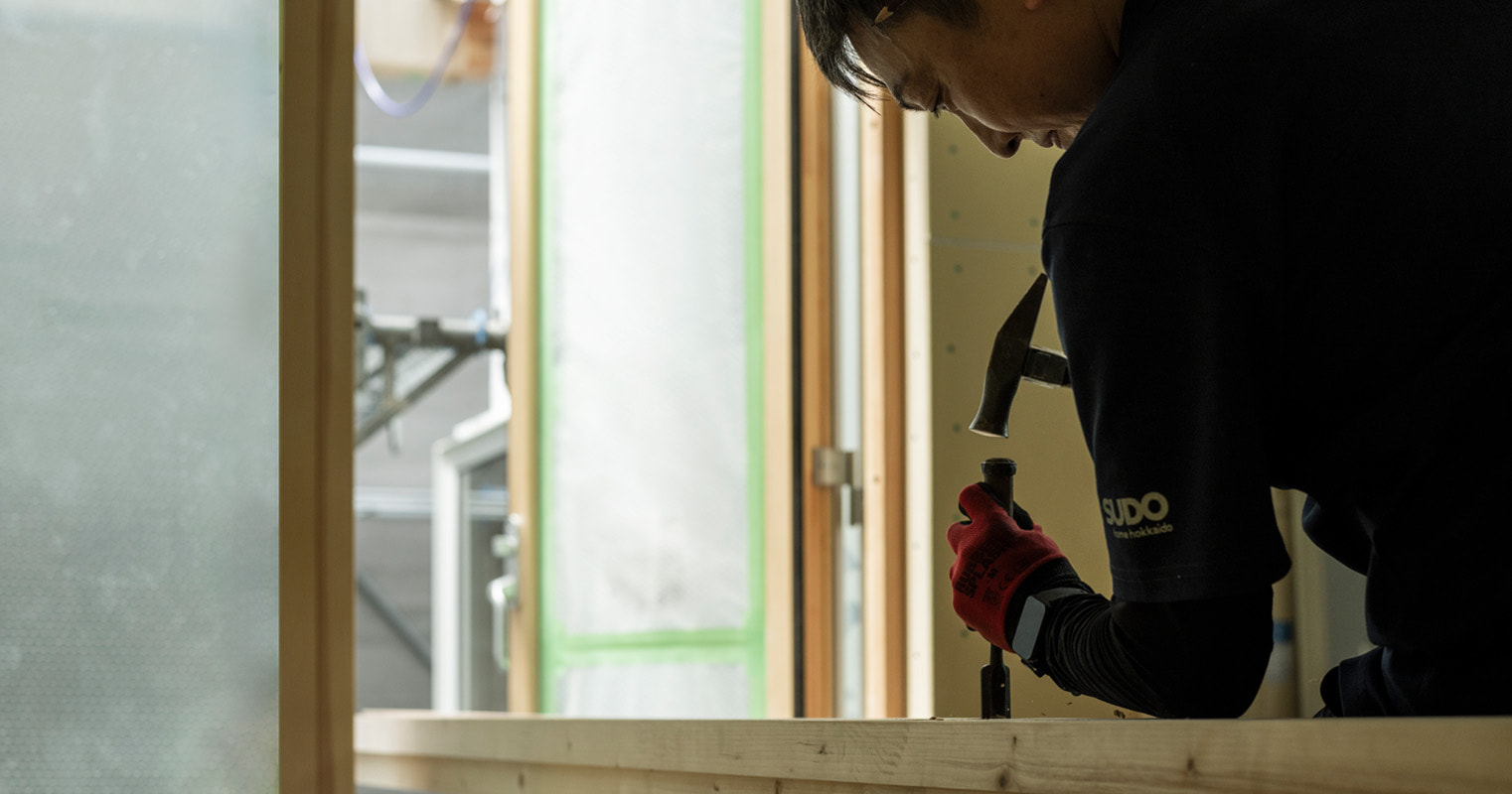 SUDOホームの家づくりは、建築大工技能士・建具製作技能士を有する自社技能職員が担当します。自社工場にて、軸組みおよび造作材の刻み、造作建具の製作なども手がけるため、常に安定した品質をご提供することができ、完成後のメンテナンスもご安心いただけます。