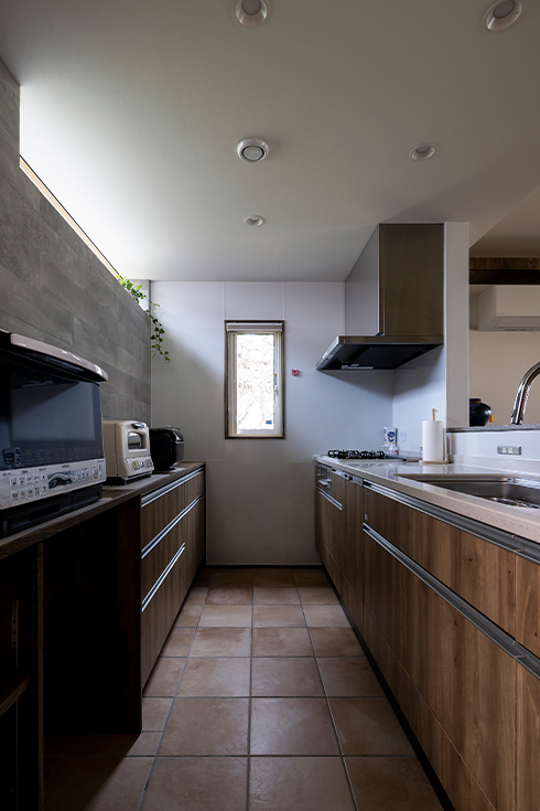 キッチンまわりには奥さんのこだわりが詰まっています。まずは家事動線。ランドリーとキッチンがつながり、その間には収納を多めに、という要望を叶えた大容量のパントリーがあります。また、リビングから見えるキッチンの壁には棚を設けないというのも奥さんからの要望のひとつ。腰から下の使い勝手のいい場所にのみ収納を設けました。