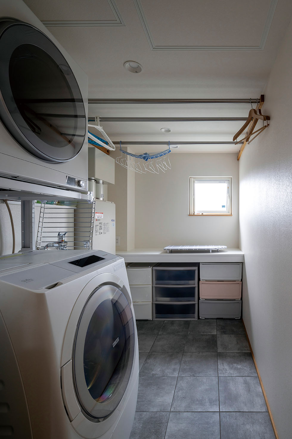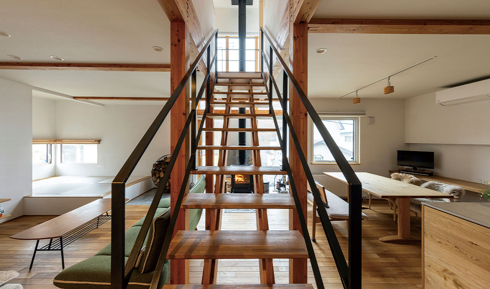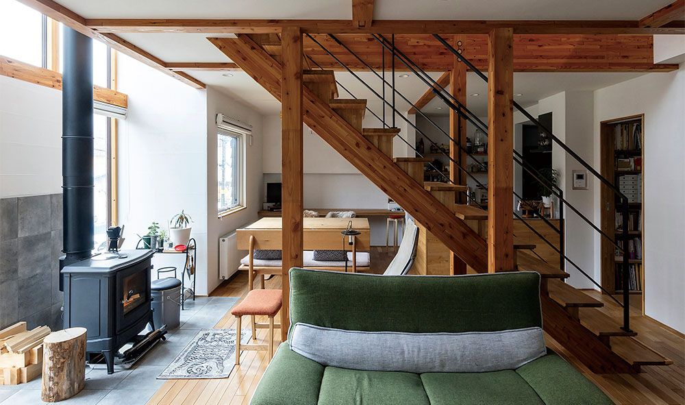 物が多いことや、共働きのため平日の家事効率を上げたいこと、キッチンを広く使いやすく、薪ストーブを導入したいなど、お二人が思い描いていた数々の希望を伝えて出来上がったのが、住まいの中心に階段を配置した個性豊かな間取りです。1階は仕切らずワンフロアにしつつ、階段や柱の配置を工夫して緩やかにエリア分け。水まわりは2階に集約してランドリールームを設けるなど、朝起きて仕事に行き、帰って家事をしてくつろぎ、寝るまでの動線も見事に効率化されています。