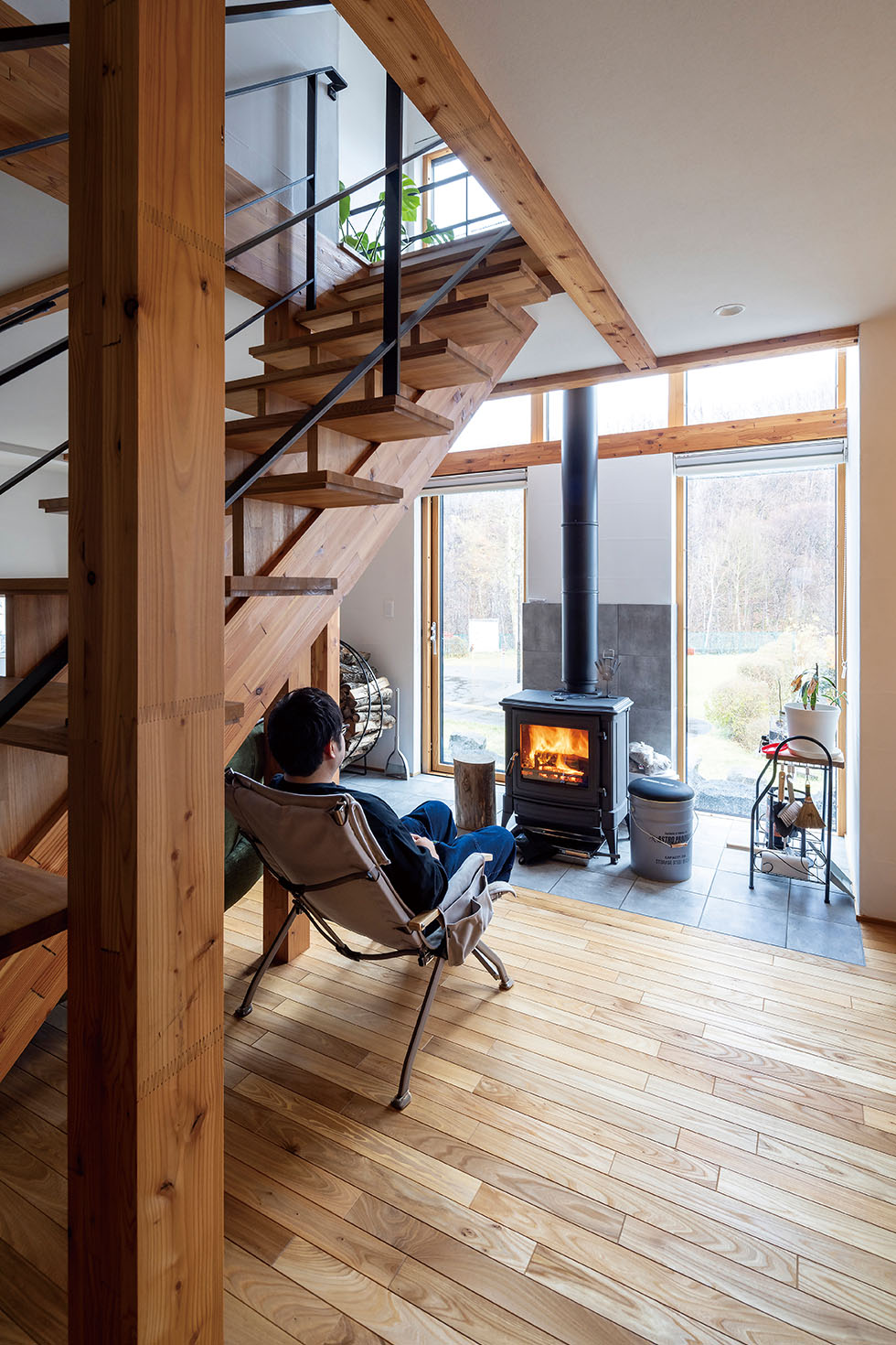 リビングとダイニング両方からつながる土間エリアには薪ストーブが鎮座。オブジェのような薪台も加わり、素敵なインテリアとしても存在感抜群です。「炎を眺めるだけでなく、煮込み料理にもチャレンジしてみたりと、思った以上に活用しています。冬がイヤじゃなくなりました」と、お二人とも薪ストーブのある暮らしを存分に楽しんでいる様子です。