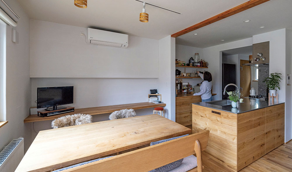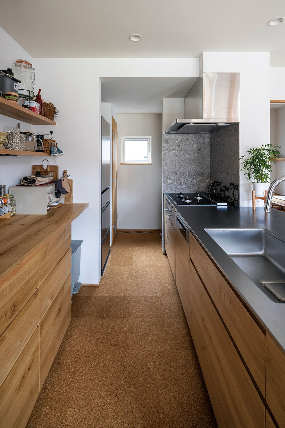 Mさん宅の主役になっているのはフルオーダーキッチン。ステンレスの天板は奥行き95㎝と広く、下部には両面に収納がたっぷり。面材はすべて無垢板で上質感あふれる仕上がりです。背面収納は吊り戸棚をやめてオープン棚とし、好きな食器などを飾れるように。夫婦で作業してもゆとりのある広さを確保した、使いやすいキッチンスペースとなりました。