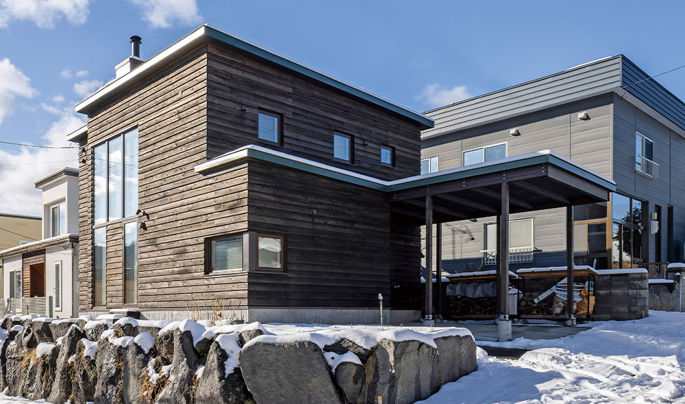 屋根/ガルバリウム鋼板、外壁/カラマツ木酢液含浸、建具/玄関ドア:木製断熱玄関ドア、窓:木製サッシ 一部樹脂サッシ