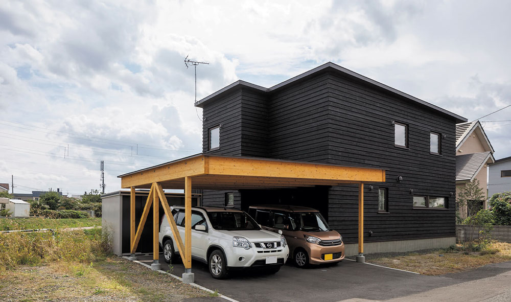 屋根/ガルバリウム鋼板、外壁/道産スギ板張、建具/玄関ドア:木製断熱ドア、窓:木製サッシ 一部樹脂サッシ