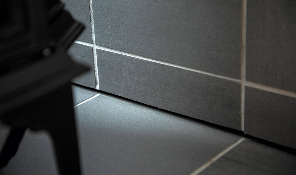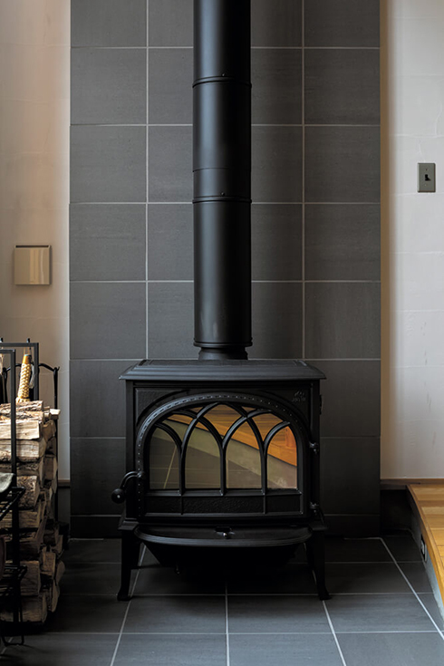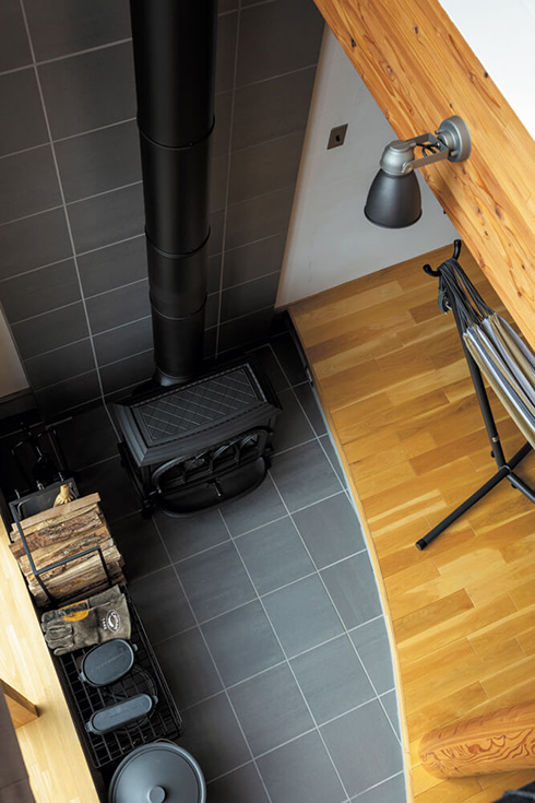 新居は、ナラの無垢床や珪藻土入りの塗り壁、タイルなど、素材感際立つ空間。その中心にある土間には、Mさんが相談に出かけた専門店で「クラシックな雰囲気が気に入った」というヨツールの薪ストーブが設置されています。ストーブに火を入れるのは休日や休日前のお楽しみ。「土間の縁に座って、庭の景色とストーブの薪火を眺めながら飲むビールの味は格別です。目指した以上にキャンプ気分が味わえるマイホームが出来ました」。