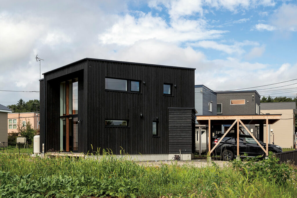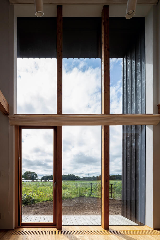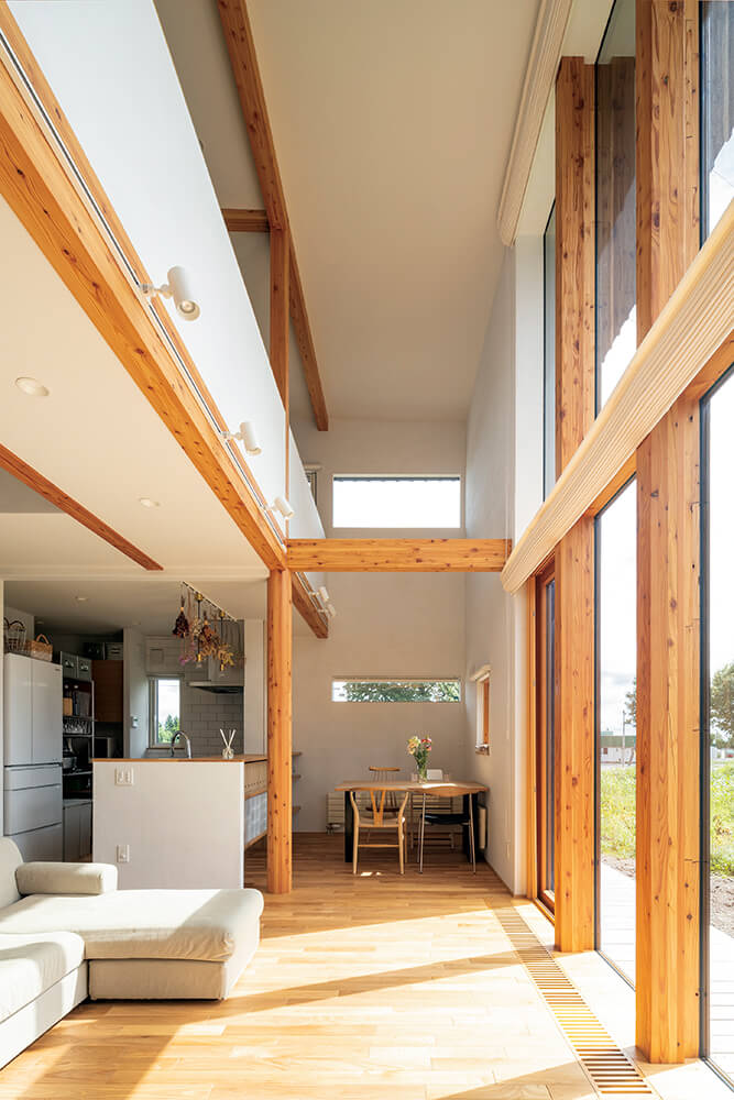 恵庭市の住宅街の一角にあるIさん宅の自慢は、リビングの縦長の大開口から見える雄大な畑風景。豊かな自然を眺めるカーテンレスな暮らしこそが、ご夫妻の家づくりの夢でした。