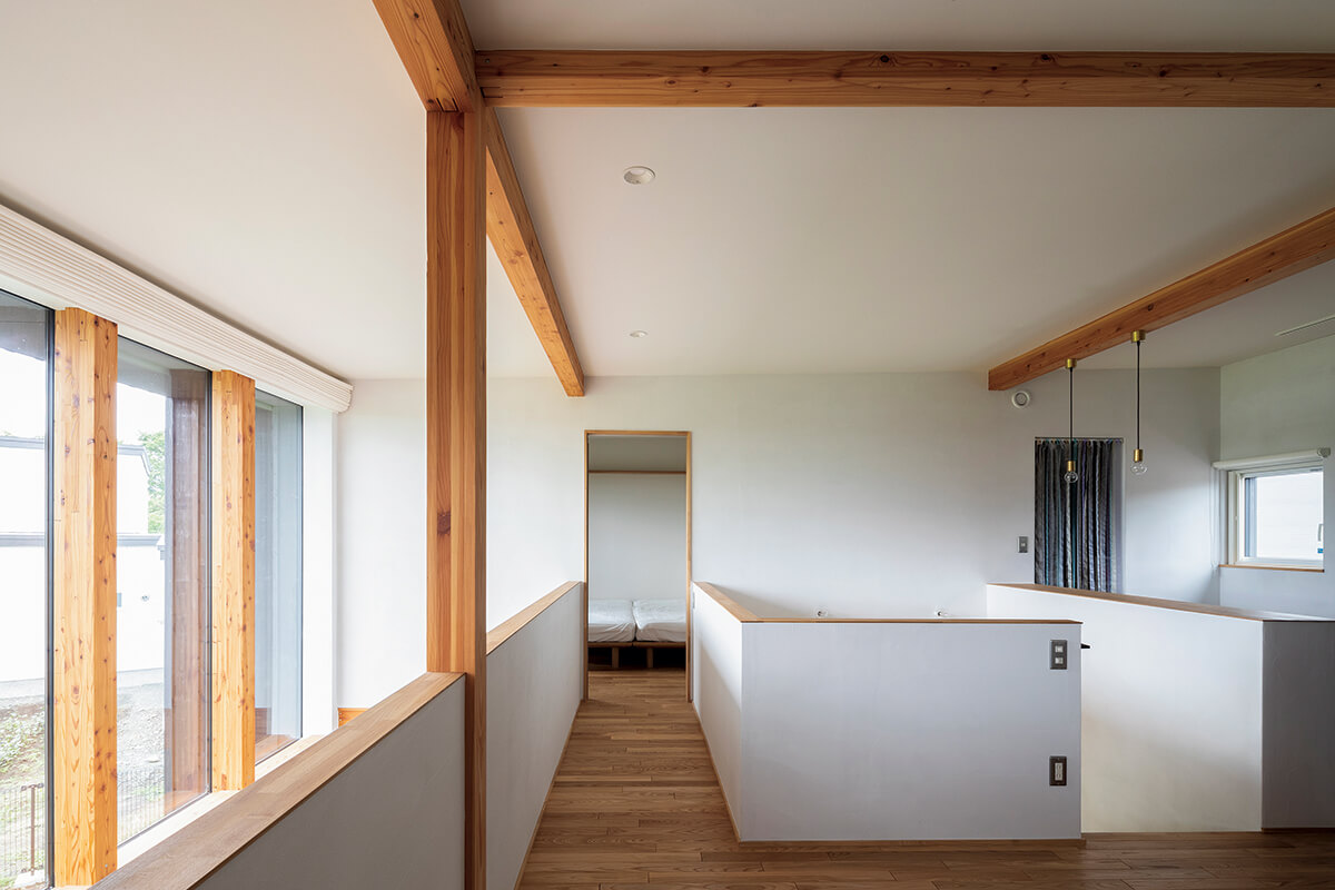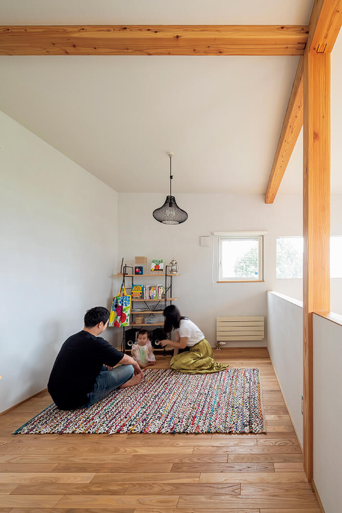 この秋で1年を迎えるIさん宅。現在、育児休暇中の奥さんは日中のほとんどの時間を、娘さんと開放感あふれるリビングで過ごしています。「窓から見える景色はもちろん、周囲の視線や、風の通り抜けにも配慮した窓配置なので、快適な暮らしを満喫しています」と話す奥さんは、畑風景を楽しみながら、のびのびと子育てを楽しんでいます。「毎年畑の作物も変わるんです。昨年は小麦だったので辺り一面綺麗な黄色になって。今年は何の畑になるのかなって考えるのも楽しいですよね」と笑顔で窓の向こうを眺めるIさんご一家でした。