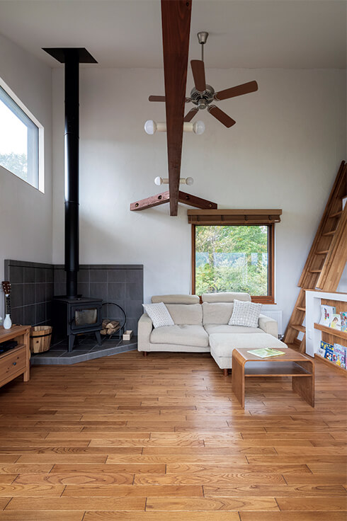 実は家づくりに関して、ご夫妻の意見はことごとく合わなかったと奥さんは笑います。折衷案では中途半端になってしまう、と最終的にはFさんの意見を尊重したそう。完成したのは眺めのいいリビングとウッドデッキ、暖炉を備えたFさんの希望どおりの家。