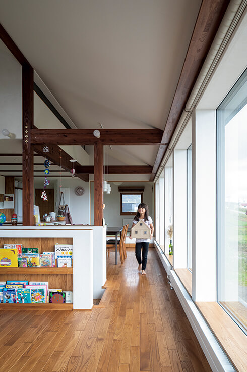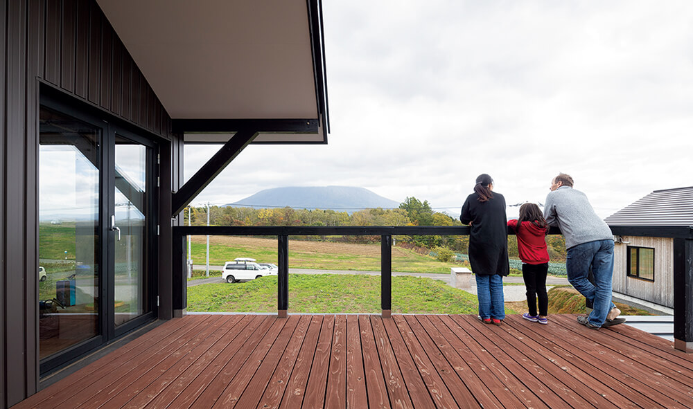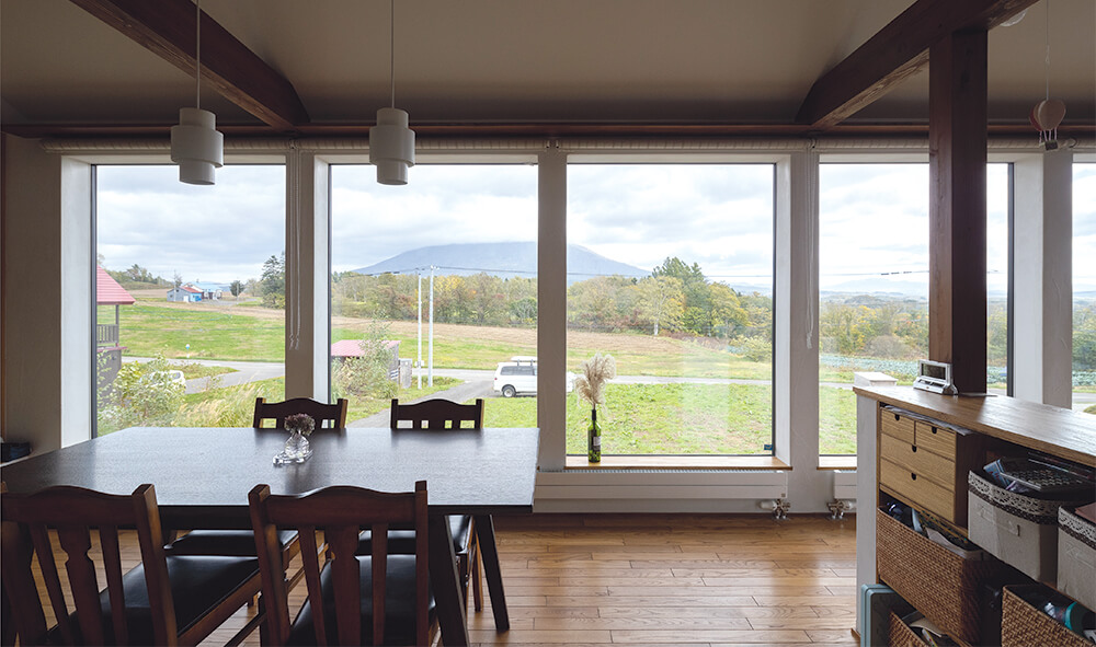 羊蹄山をドーンと正面に望むFさん宅。道路に向かって下がっている傾斜地の一番奥に家を建て、リビングは2階に据えています。ダイニングからリビングにかけて並ぶ東向きの大きな6枚の窓は、羊蹄山の姿を美しく切り取るだけでなく、冬の採暖にも活躍。太陽が出るとすぐに2階を暖めてくれます。