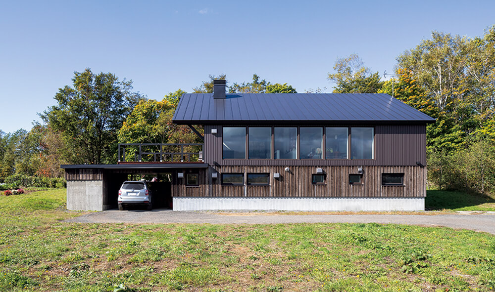 屋根/ガルバリウム鋼板、外壁/ガルバリウム鋼板角波・北海道カラマツ木酢液含浸板、建具/玄関ドア:木製断熱ドア、窓:木製サッシ・樹脂サッシ