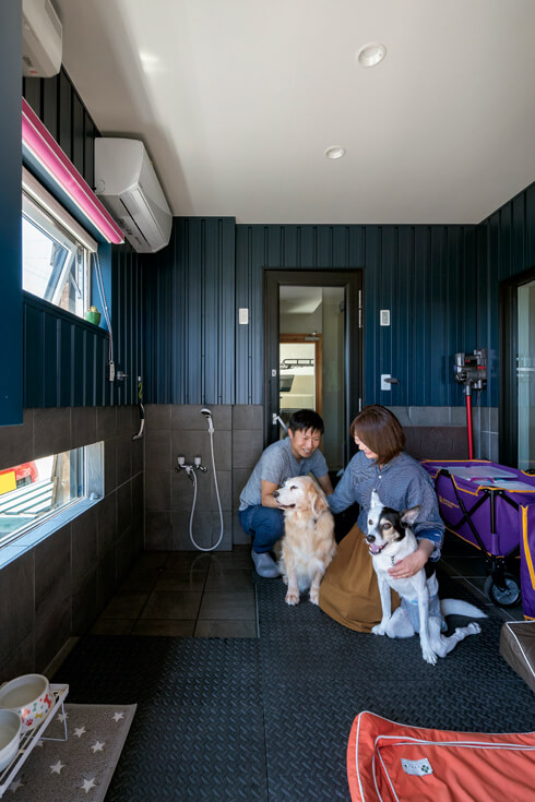 シャワー付きのドッグルームとリードなしで走り回れるドッグランは、家の建設が決まった時にご夫妻が強く希望されていたものです。実は引っ越し後に1頭が病気で下半身が不自由に。トイレの世話も必要になりましたが犬たちが快適に過ごせる環境を整えていたので、「犬の体調が悪くなったのがこの家に住んでからで本当によかったです」と奥さんは話します。