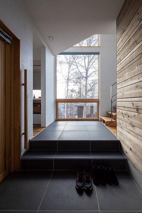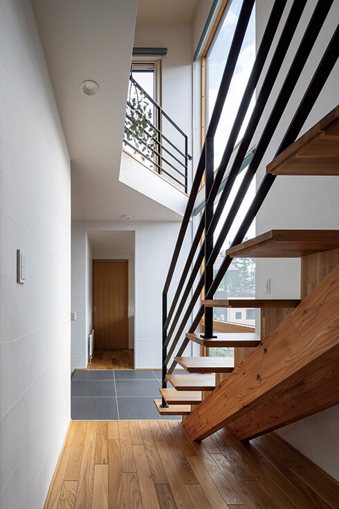 扉を開けて最初に目を惹くのが大きな窓の向こうに立つシラカバの木。美しい自然が出迎えてくれる印象的な玄関ホールとなっています。水まわりや寝室、子ども部屋を1階にまとめることで広さを確保した開放的な2階LDKは、無垢床や塗り壁の素材感が心地よい上質な空間。リビングのピクチャーウィンドウからは四季折々の景色をダイナミックに楽しめます。LDKとつながるルーフバルコニーもAさん宅のビューポイントで、「夏は緑を楽しみながらバルコニーで朝食をとりました」と満喫中。子どもたちも内と外を愛犬とともに自由に駆け回り、のびのびと新しい家での暮らしを楽しんでいます。
