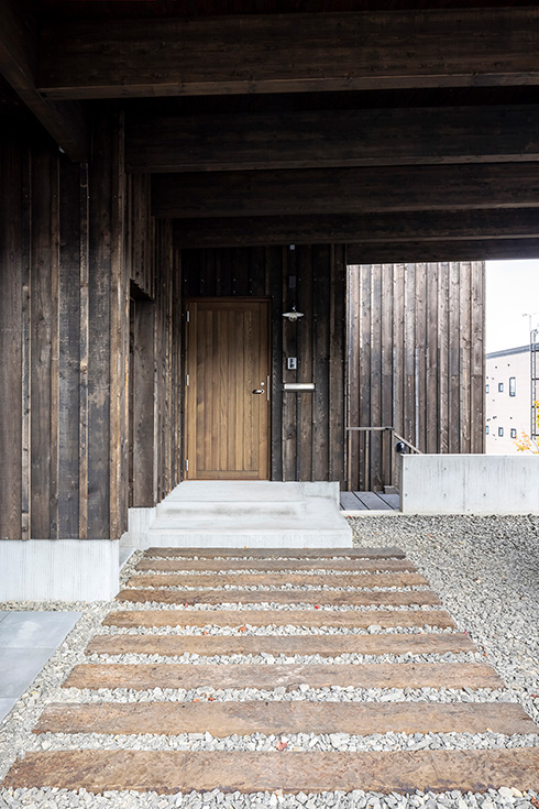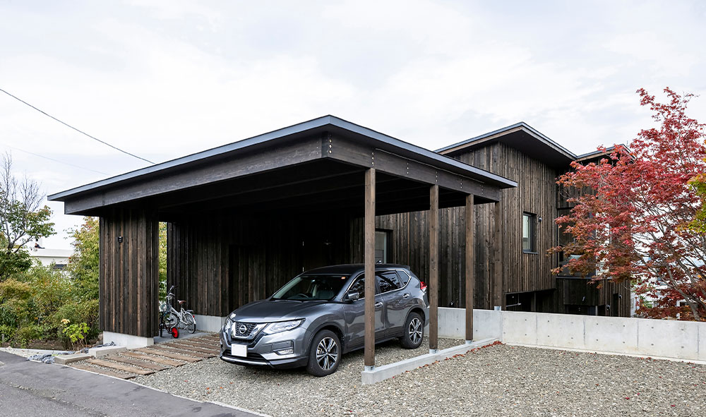 屋根/ガルバリウム鋼板、外壁/道産カラマツ、建具/玄関ドア:木製断熱ドア、窓:木製サッシ(トリプルガラス)・樹脂サッシ(トリプルガラス)