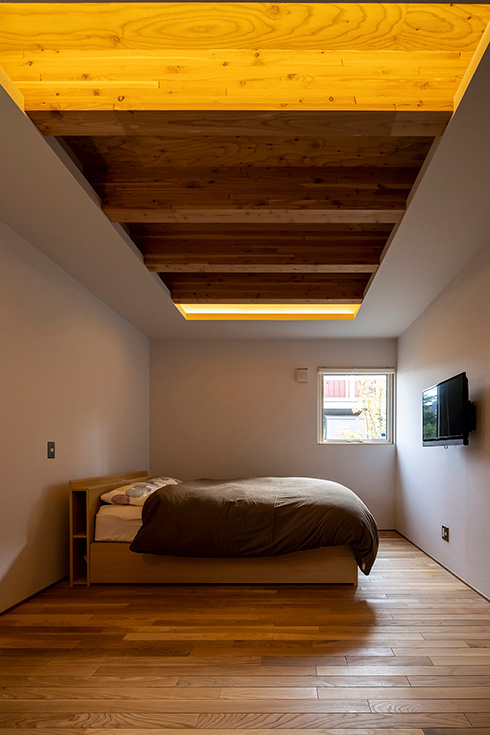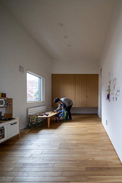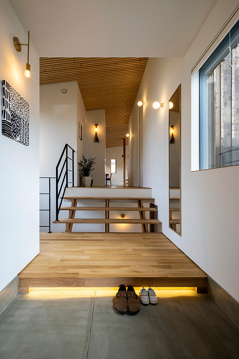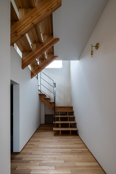 友人たちを家に招いておもてなしすることが多かったというTさん。「自分たちだけなら狭くていいのですが、遊びに来た人には快適に過ごしてもらいたいですね」と語ります。そのため、玄関を入ってすぐ上下に分かれる階段を設け、1階は寝室など家族が使うプライベートエリア、2階は来客に自由にくつろいでもらえるよう、広いLDKとフレキシブルに使える洋室のパブリックエリアに空間を分けました。
