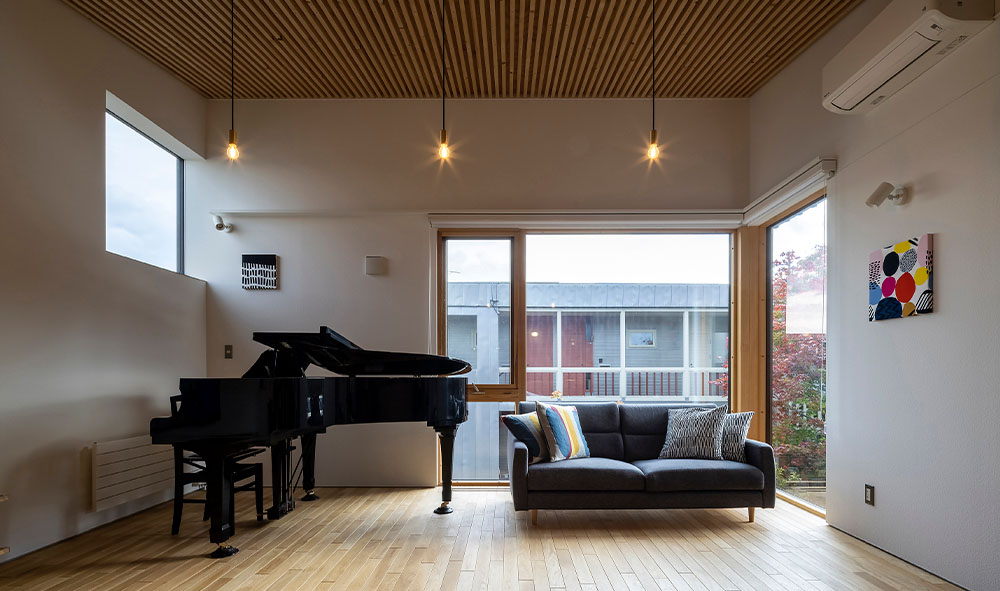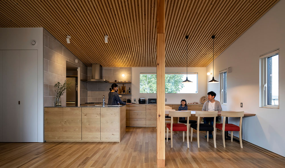 高台にある閑静な住宅街で、142坪の広い土地を手に入れたTさん。2mの高低差がある傾斜地のため、最初から注文住宅しかないと考えていました。設計事務所や工務店を数社比較検討し選んだのが、傾斜地やスキップフロアなどの実績も豊富なSUDOホームです。「まず住宅性能とデザインのバランスがいいと感じました。自社大工による手仕事が丁寧という印象で、私たちのこだわりも熱心に聞いてくれたので、お任せできると確信したんです」とTさん。