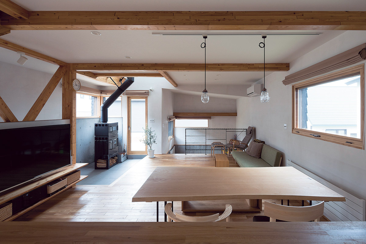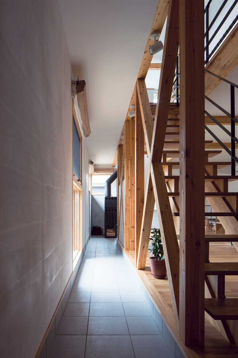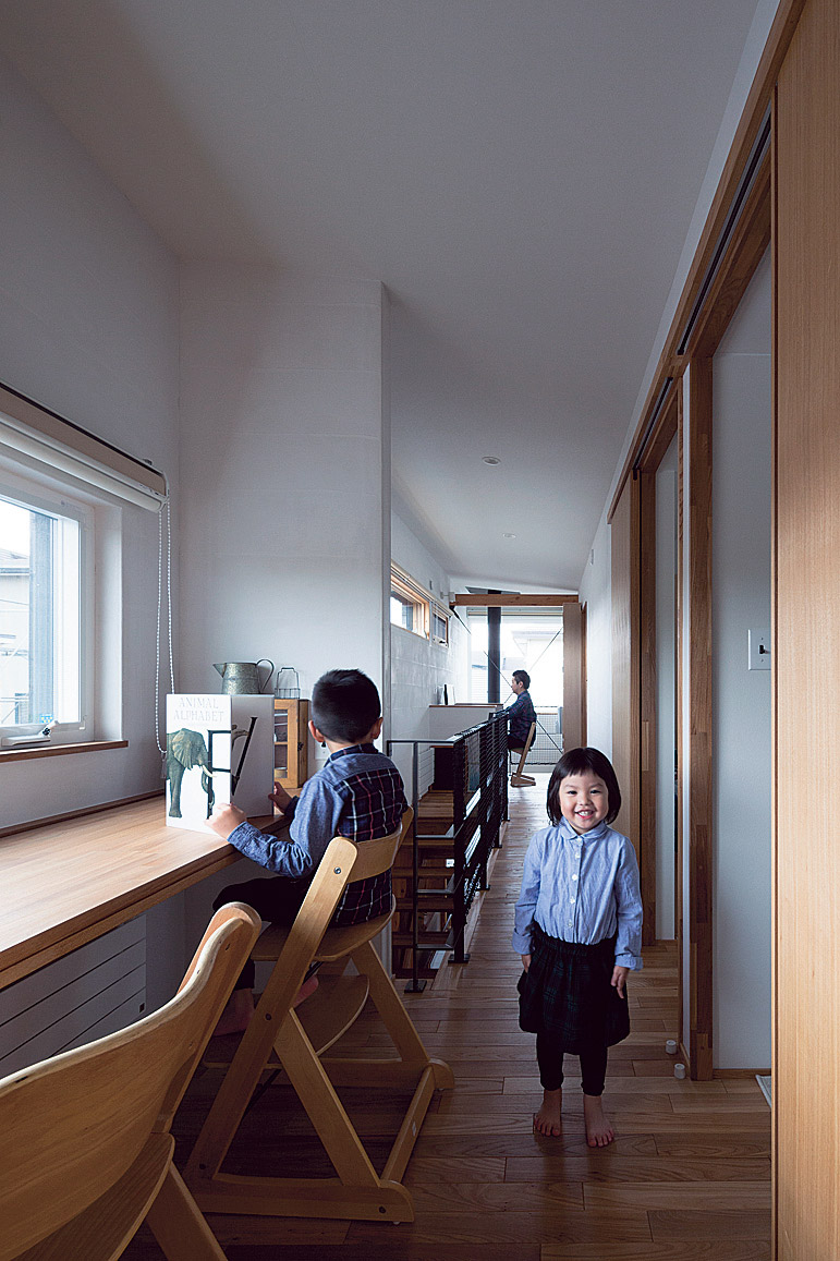 子どもの通学や買い物の利便性などを考えて購入した細長い傾斜地に合わせ、雑誌の写真を参考にしながら自分たちで基本プランを考えたというご夫妻。「家を建てるなら薪ストーブがほしいと思っていたので、玄関からリビングへ長くつながる土間を設けてそこにストーブを置きたいとか、LDKの一角には子どもが心置きなく遊べるプレイルームがほしいとか、2人で相談していたことを基本にプランをつくってもらい理想的な住まいができました」と奥さん。