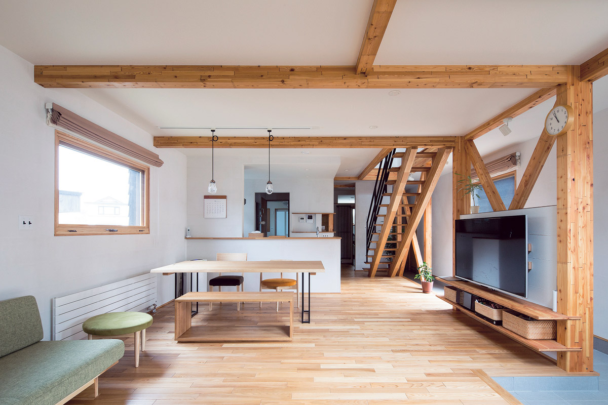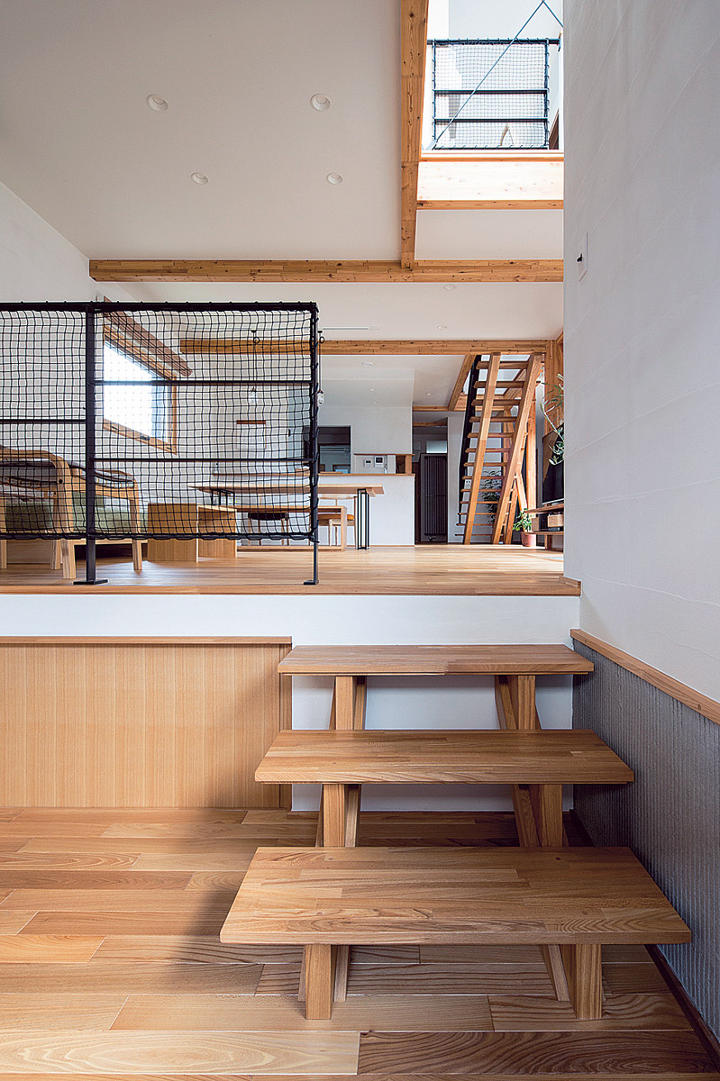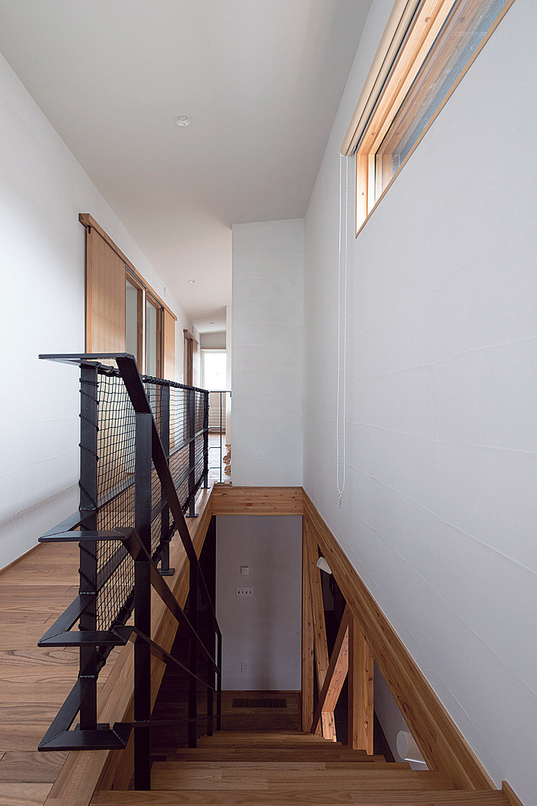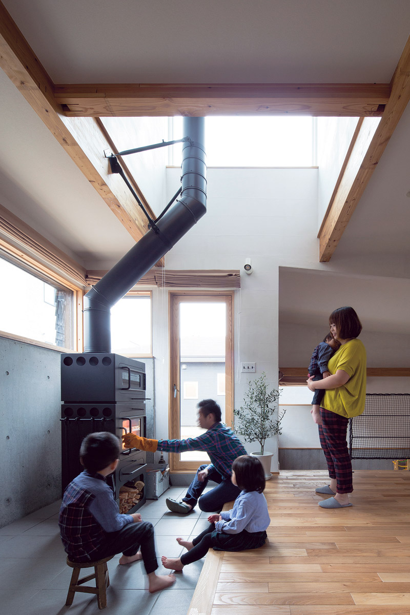 子どもの通学や買い物の利便性などを考えて購入した細長い傾斜地に合わせ、雑誌の写真を参考にしながら自分たちで基本プランを考えたというご夫妻。「家を建てるなら薪ストーブがほしいと思っていたので、玄関からリビングへ長くつながる土間を設けてそこにストーブを置きたいとか、LDKの一角には子どもが心置きなく遊べるプレイルームがほしいとか、2人で相談していたことを基本にプランをつくってもらい理想的な住まいができました」と奥さん。