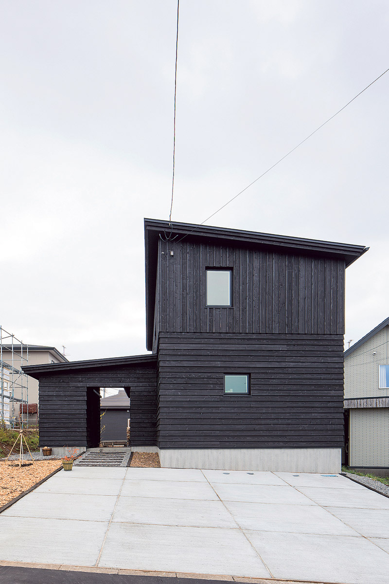 屋根/ガルバリウム鋼板 フラットルーフ、外壁/北海道産スギ板、建具/玄関ドア:木製断熱ドア、窓:木製サッシ