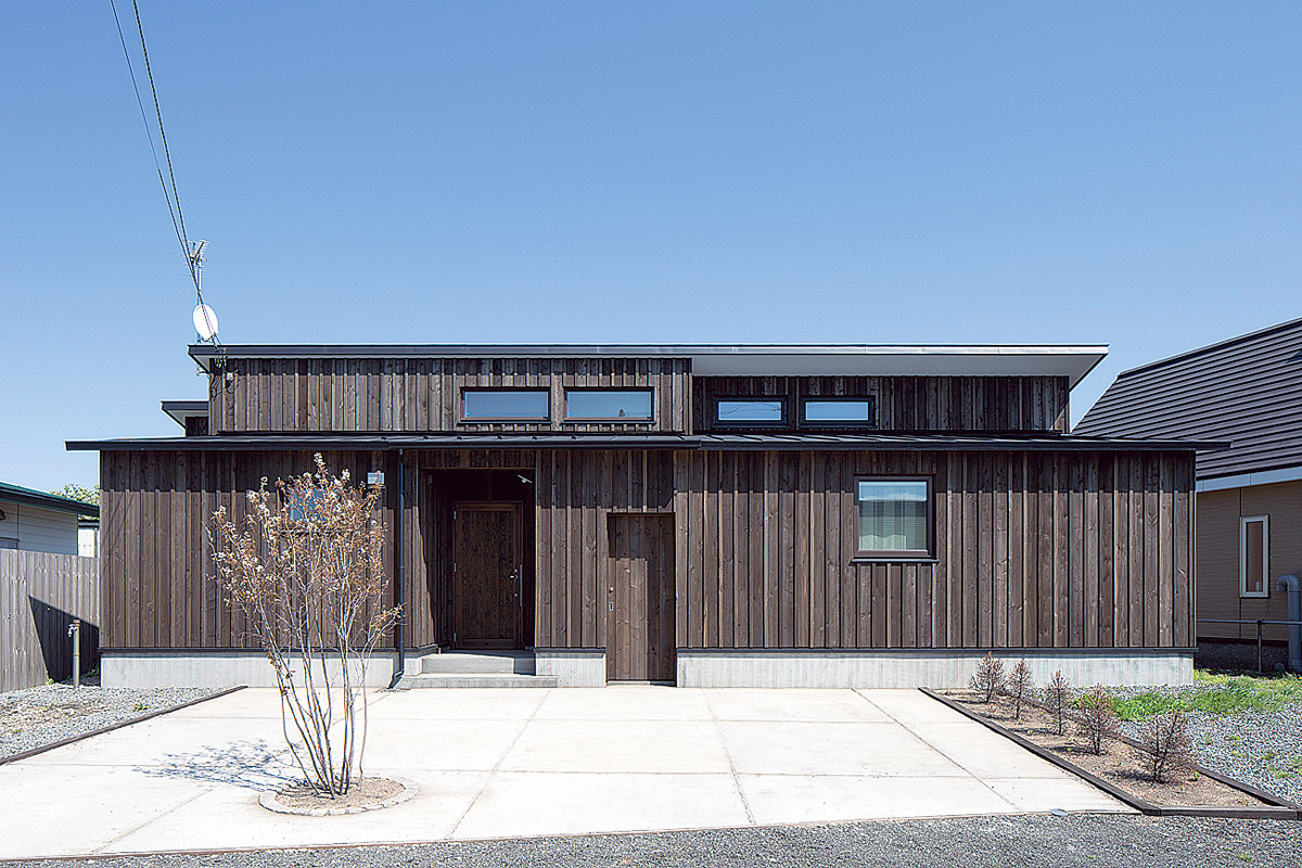 屋根/ガルバリウム鋼板、外壁/道産カラマツ板木酢液含浸、建具/玄関ドア:木製断熱ドア、窓:木製断熱サッシ 一部樹脂サッシ