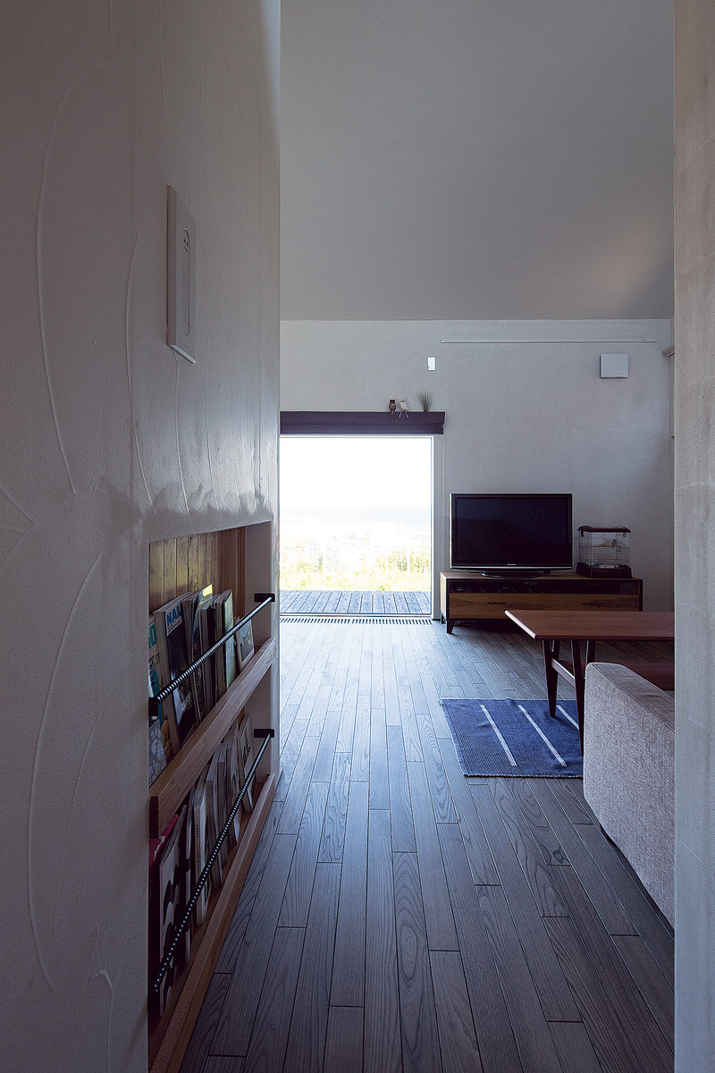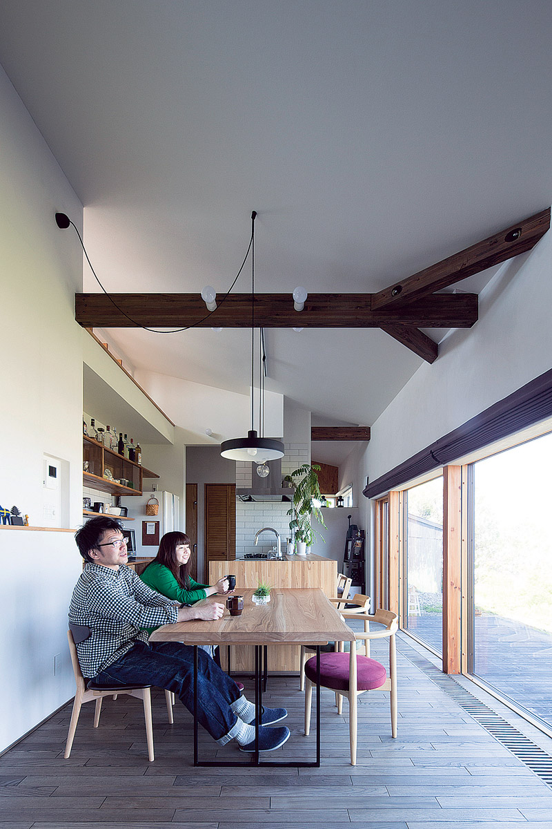 当初は2階建ての家を考えていたHさんご夫妻でしたが、担当者から提案されたLDKの大開口から海を見渡す平屋のプランを見て驚いたそうです。「家は2階建てという固定観念がありましたから、眺望を生かすなら2階にLDKのプランになるのではとイメージしていました。深瀬さんが平屋を提案してくれたおかげで無駄なスペースもなく、LDKから直接庭に出られるし景色の良さも存分に楽しめる住まいになりました」。