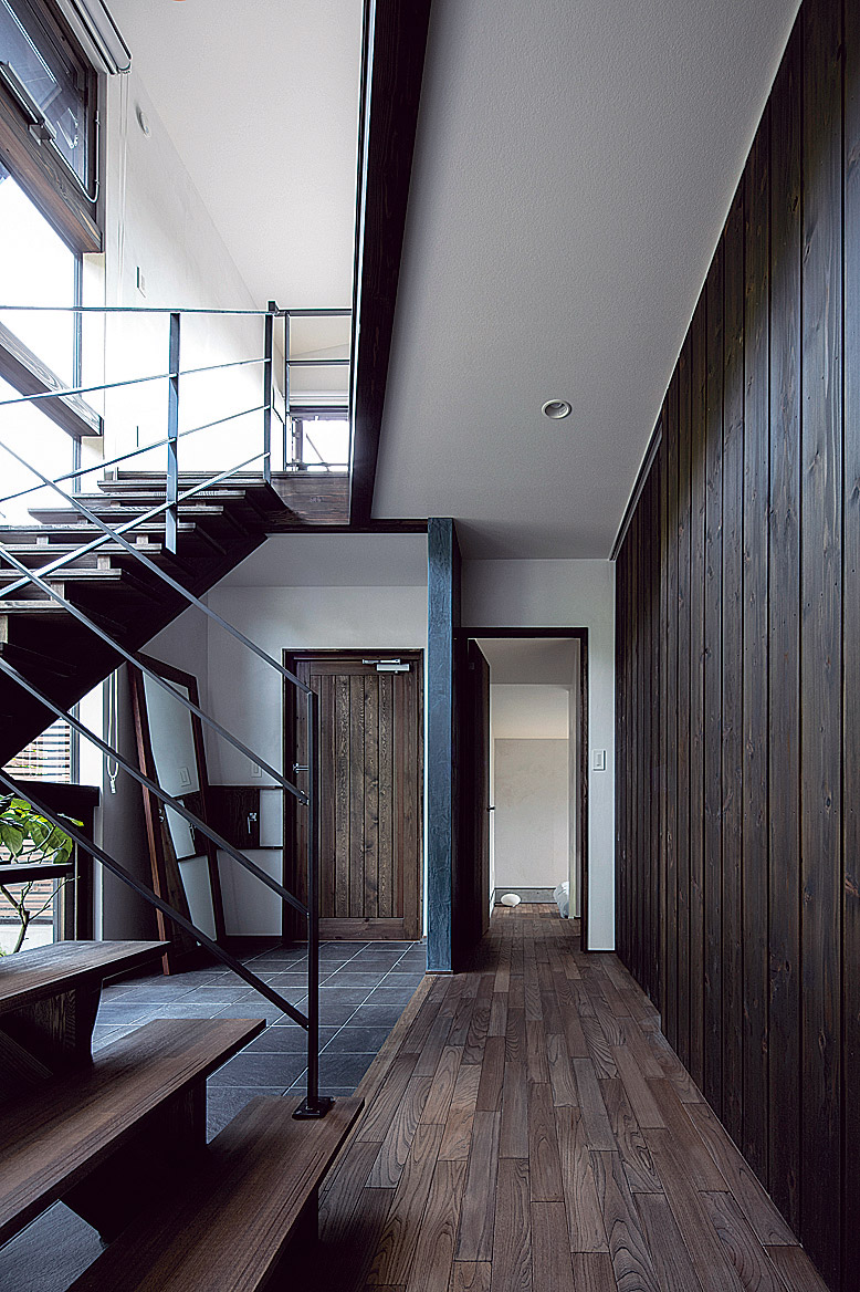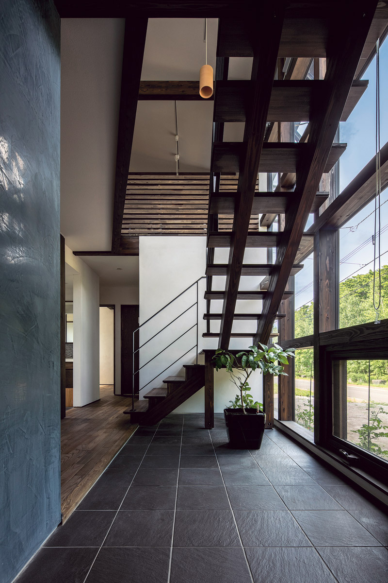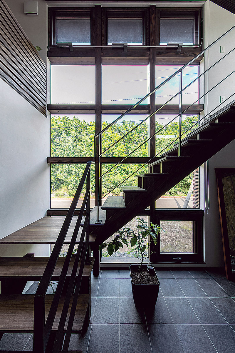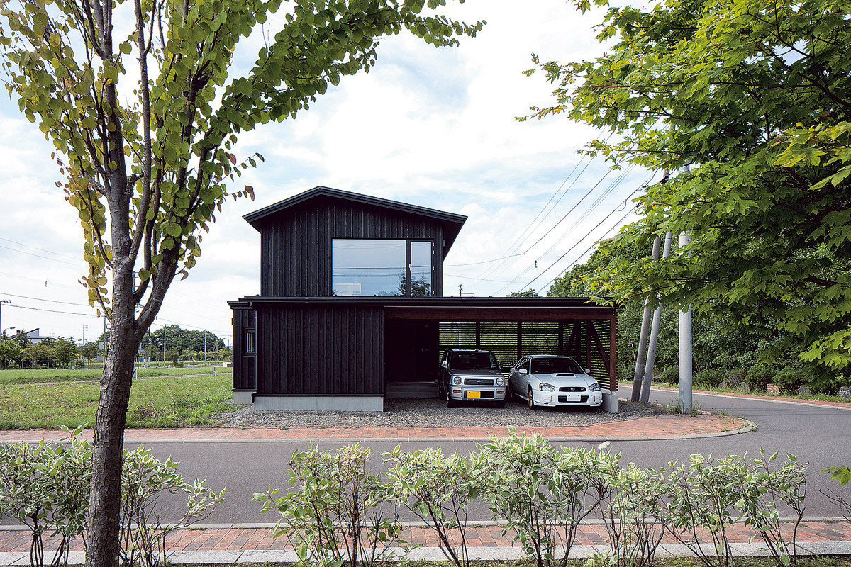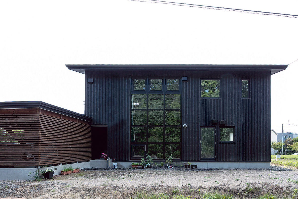 屋根/アスファルトシングル、外壁/道産スギ板、建具/玄関ドア:木製断熱ドア、窓:木製サッシ(トリプルガラス)
