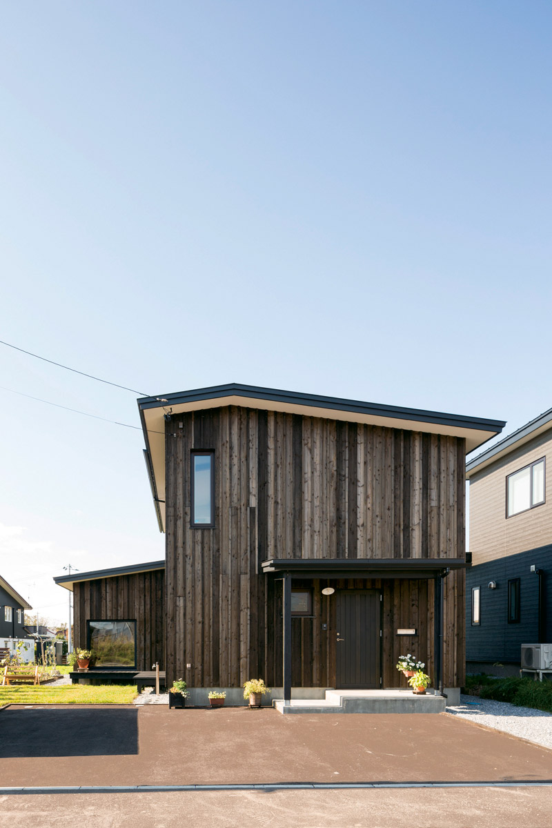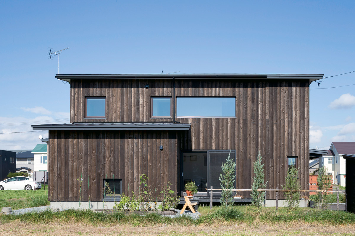 屋根/ガルバリウム鋼板、外壁/北海道産カラマツ木酢液含浸板、建具/玄関ドア:木製断熱ドア、窓:木製断熱サッシ・樹脂断熱サッシ